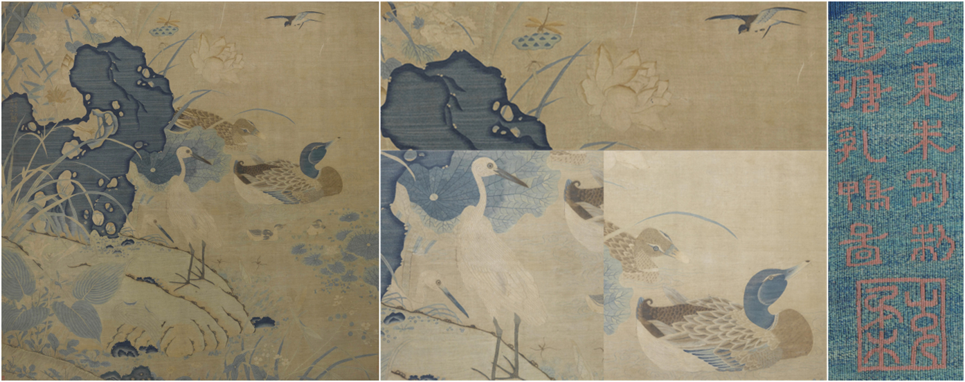 《莲塘乳鸭图》图中的景象蕴含着成双成对、相濡以沫的美好寓意。作品中的鸭子、乳鸭、白鹭甚至浮于水面的昆虫都是成双成对的;但翠鸟、燕子、蜻蜓却都是单独的一只。因此专家们推测,珍藏在上海博物馆的『南宋朱克柔缂丝《莲塘乳鸭图》』并非是一件完整的缂丝作品,很可能是从原件上裁剪下来的部分。