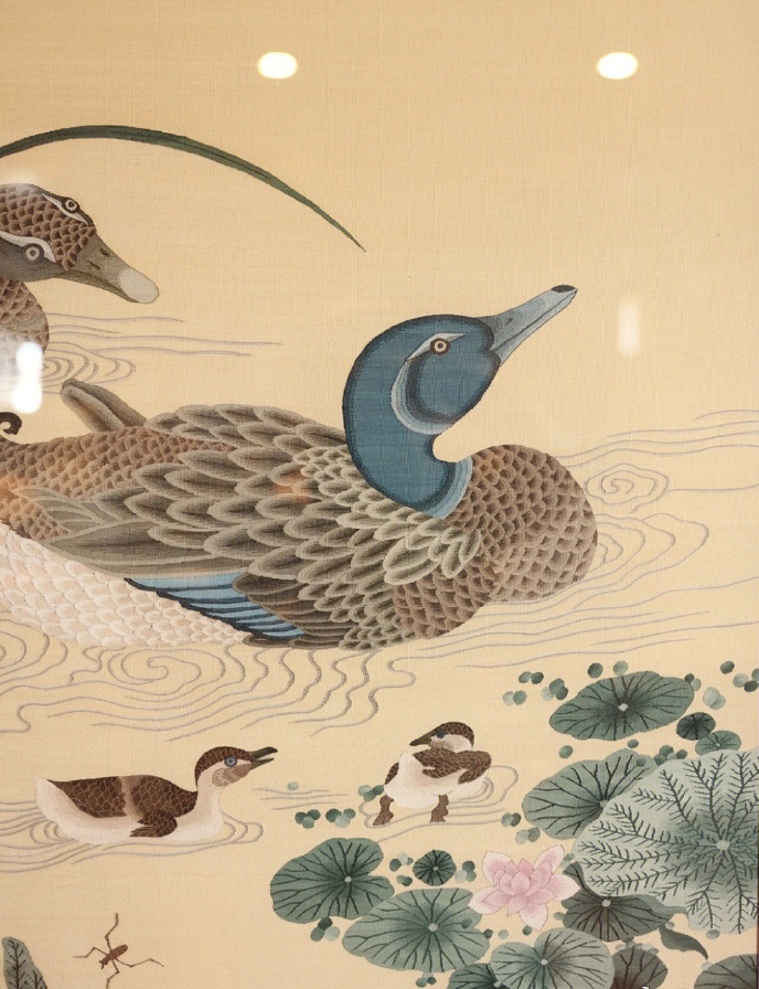 《莲塘乳鸭图》首先以经线做地子,然后用墨线勾勒图案的轮廓;而色彩是用纬线织就出来,图案从下往上慢慢呈现,需要经年累月才能织就。这幅作品无论从正面还是背面都能看到——盛开的莲花拥抱一池春水,水中双鸭惬意,乳鸭萌萌。朱克柔作为女性,其特有的细致和耐心使其将长短戗发挥到了极致,从而形成了著名的“朱缂法”。我们从图中可以看到她的细腻,也能感受到她的坚韧。