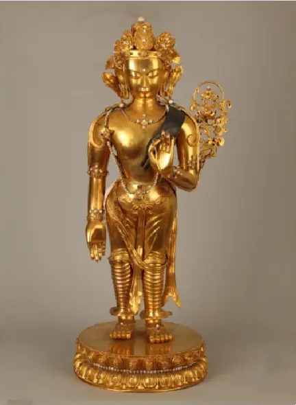 清金立佛像为乾隆皇帝亲自督造,另有尼泊尔国王进贡一说。清金立佛像的制作工艺精湛,黄金的铸造和珍宝的镶嵌手法上乘,是清朝国力鼎盛时期的产物,代表了清代宫廷造像工艺最高水平。通高88 厘米,为喇嘛教佛像,工艺精湛,含金量较高。清宫遗物,似为藏教首领进贡之物。“□嘛呢叭□吽”为藏传佛教六字真言。“□”表示身、口;意为“与佛成为一体”;“嘛、呢”为如意宝;“叭咪”比喻法性如莲花一样纯洁;“吽”为祈愿成就。得到“正觉”。