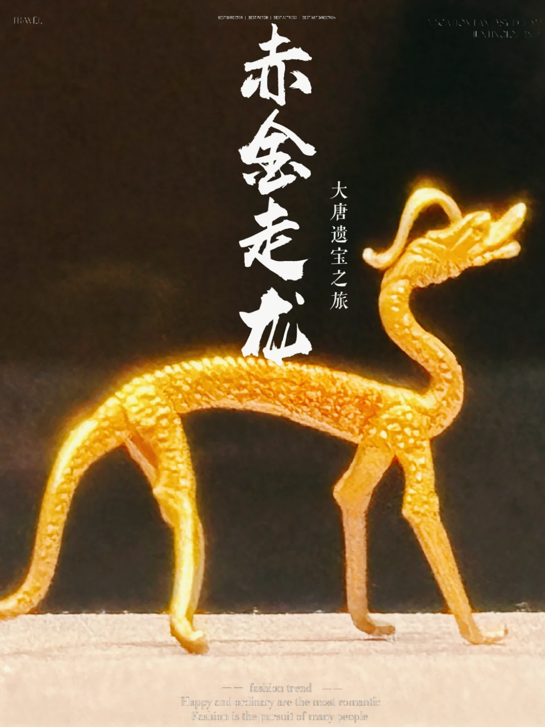 唐赤金走龙为一组小金龙,最高的2.8厘米,最矮的2厘米,身材纤细,阔嘴伸颈,头顶双角,折曲于脑后,圆眼深目,两唇张开,颌腮部位饰长鬃纹样颈弯二曲,身上鼓,尾下拖,末端上卷,除脊背和尾脊有长鬃纹样外,满身皆饰深凹的网点纹,为饰片状鳞纹,通体雕满片片翘动的鳞片,大小均在毫米之间似用钎尖插点而成,阔嘴,长尾卷舒, 作各种姿态的行走状。