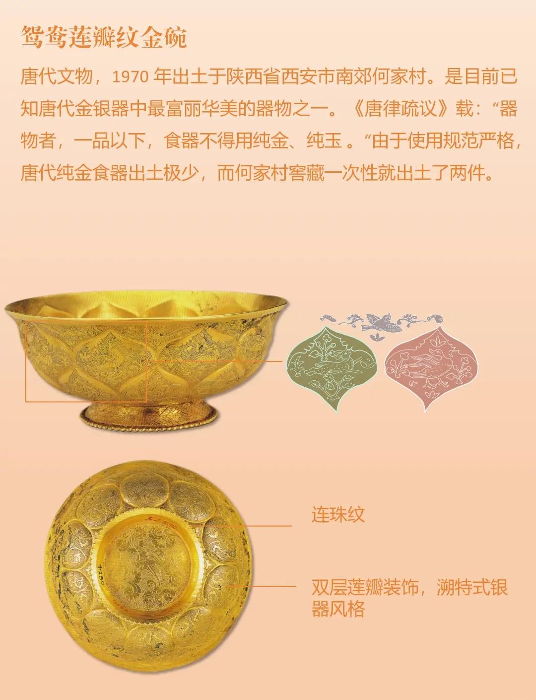 鸳鸯莲瓣纹金碗:成对成双,纹饰精美华丽,彰显盛唐金银器造诣。