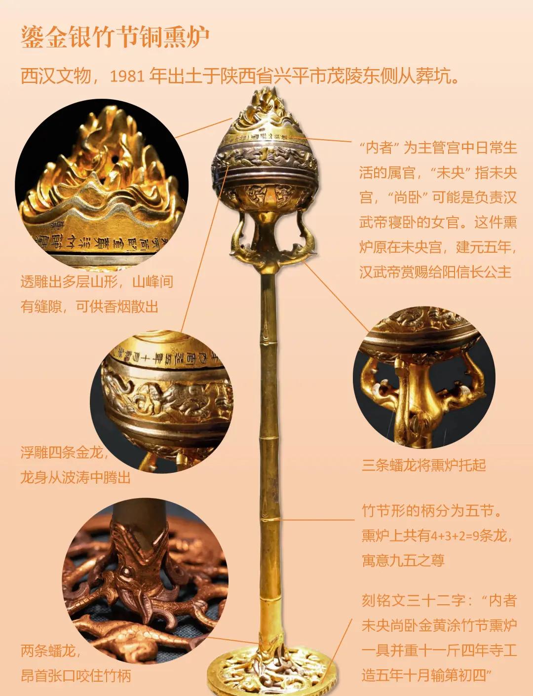 鎏金银竹节铜熏炉:汉代宫廷宝物,炉盖博山造型,九条龙纹装饰,工艺精湛非凡,见证昔日皇家奢华。(在秦汉馆)