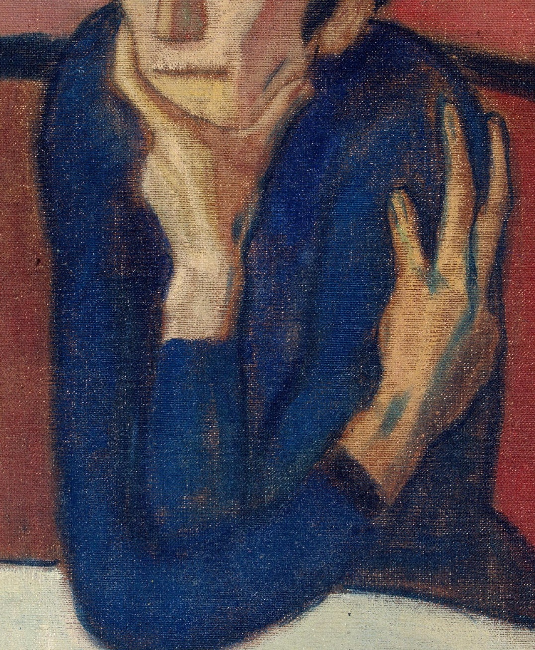 毕加索将这位孤独的女人“摆放”在咖啡馆的桌子上,脏红色调的背景墙,透着她无家可归的失落感。刻意强调的平整的画布,墙壁的颜色和大理石桌子的蓝色调,压缩了女人周围的视觉空间,更显得无望与寂寞。
