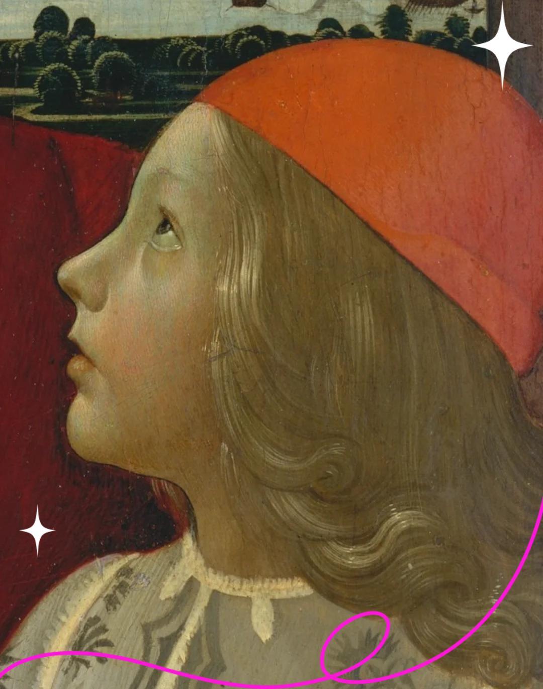 This dynastic portrait shows the Florentine banker Francesco Sassetti and his young son Teodoro, born in 1479. Teodoro was named after his elder brother, who died that same year. The boy’s pose reflects the preference for presenting women and children in profile to accentuate their holiness and purity, while the frontal, contemplative gaze of his father emphasizes the wisdom (and worries) of age. Sassetti managed the Medici banks in Avignon, Geneva, and Lyons, and was an advisor to Piero de’ Medici and Lorenzo the Magnificent. The background shows an oratory built by Sassetti in Geneva.