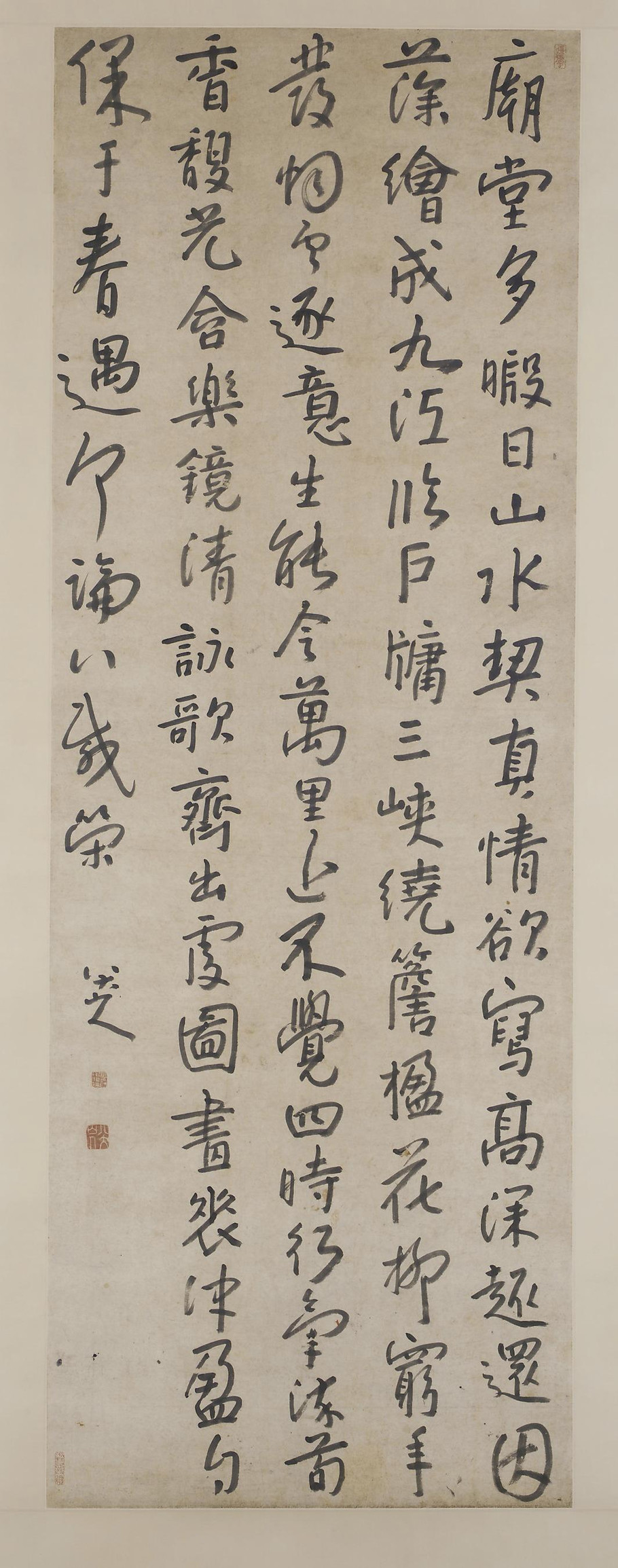 八大山人善画山水和花鸟。他的画,笔情恣纵,不构成法,苍劲圆秀,逸气横生,章法不求完整而得完整。他的一花一鸟不是盘算多少、大小,而是着眼于布置上的地位与气势。及是否用得适时,用得出奇,用得巧妙。这就是他的三者取胜法,如在绘画布局上发现有不足之处,有时用款书云补其意。八大山人能诗,书法精妙,所以他的画即使画得不多,有了他的题诗,意境就充足了,他的画,使人感到小而不少,这就是艺术上的巧妙。