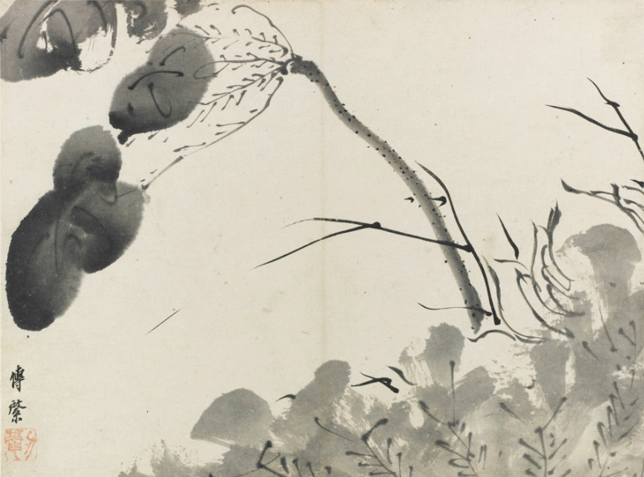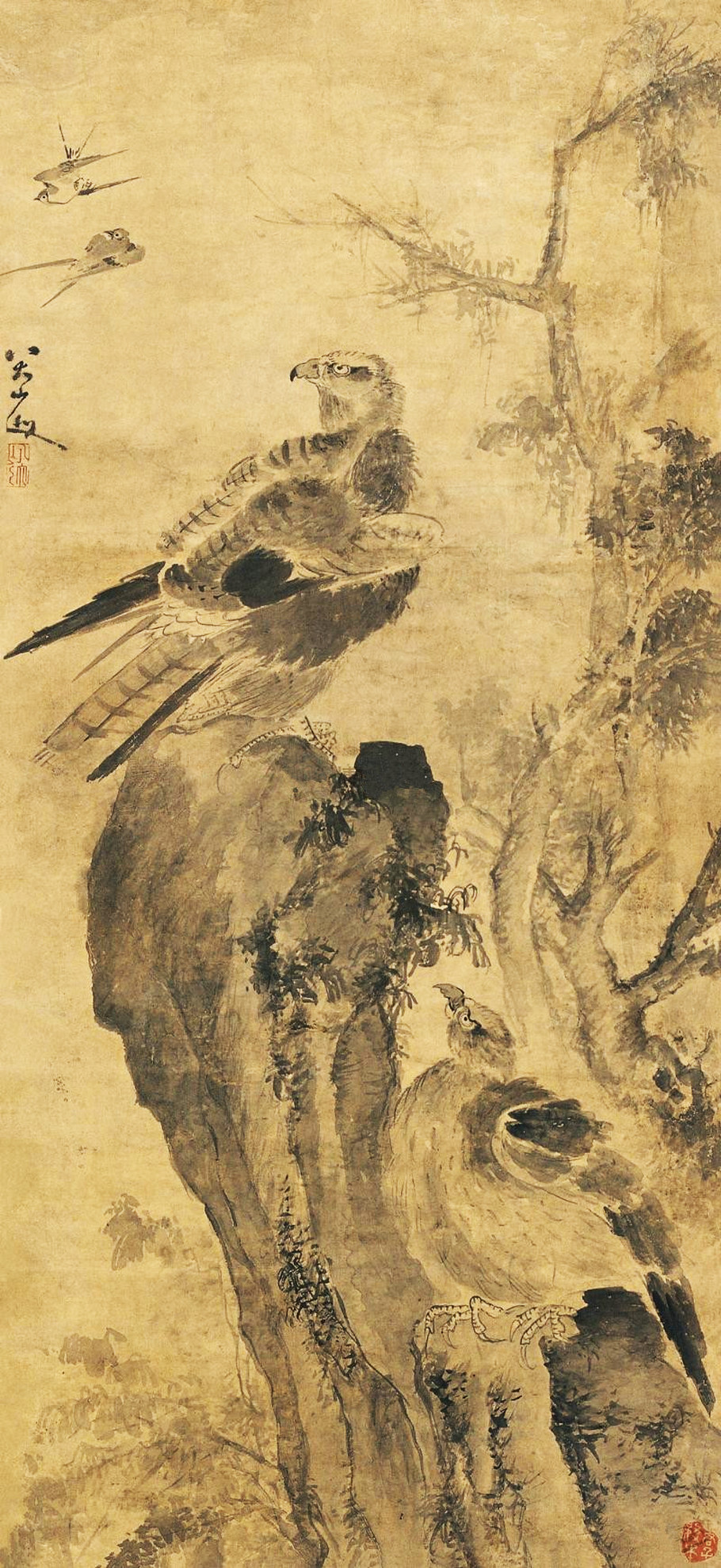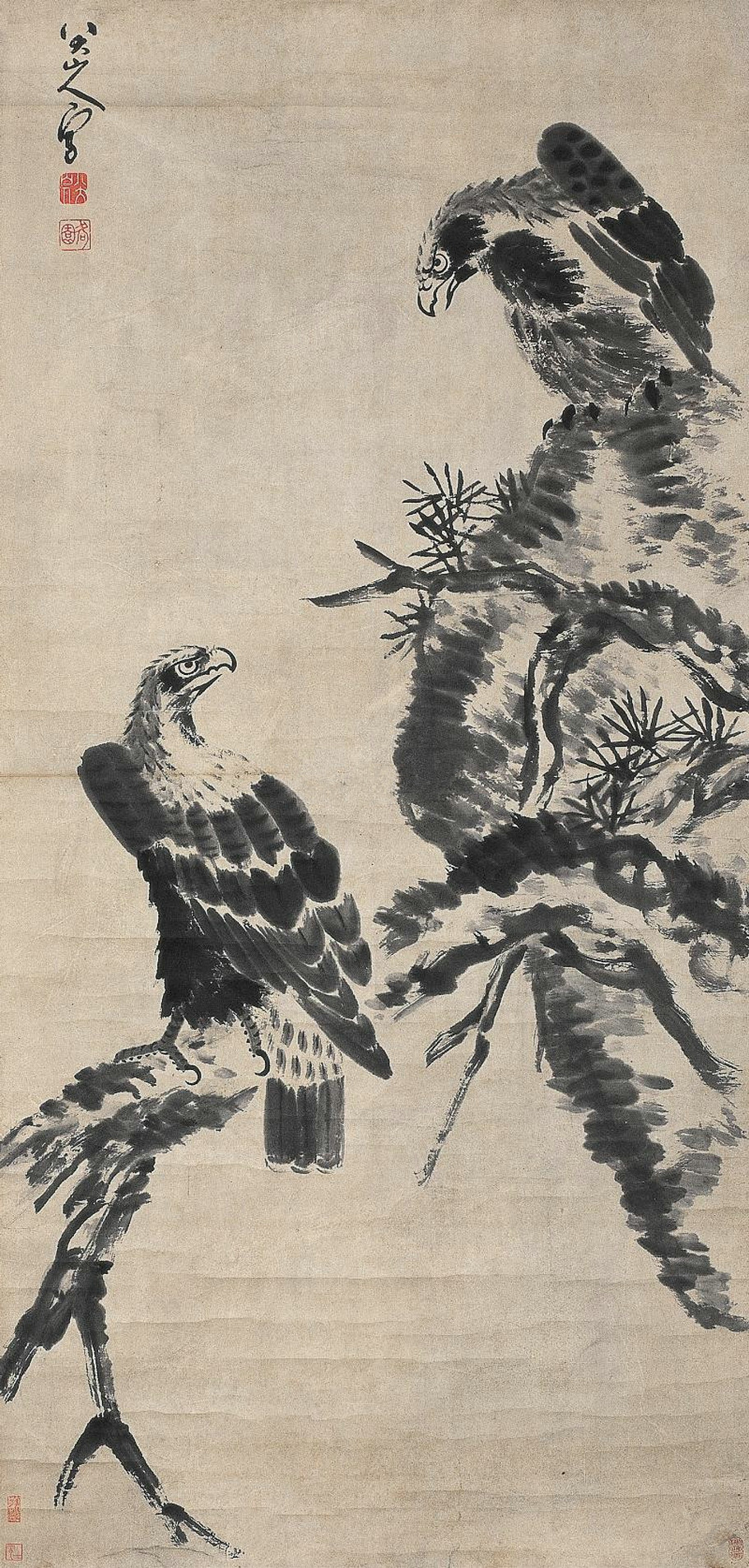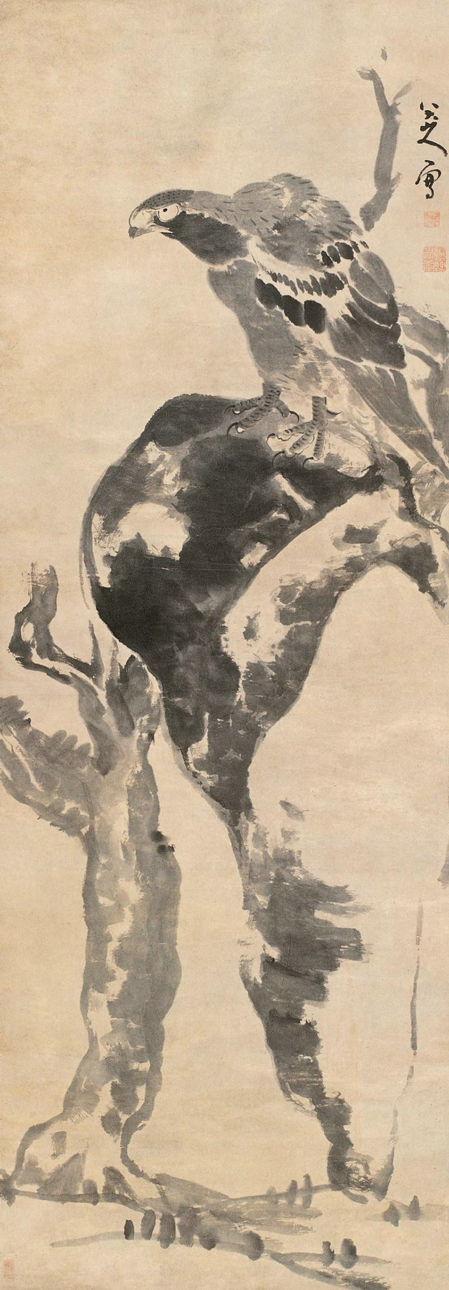 他是明太祖朱元璋第十七子朱权的九世孙,本是皇家世孙。明亡后削发为僧,成了亡命之徒,后改信道教,住南昌青云谱道院。擅书画,花鸟以水墨写意为主,形象夸张奇特,笔墨凝炼沉毅,风格雄奇隽永;山水师法董其昌,笔致简洁,有静穆之趣,得疏旷之韵。擅书法,能诗文,用墨极少。朱耷一生坎坷,曾一度精神失常,痛定思痛后,他选择背过身去,与世隔绝,在创作中安放自己孤独的灵魂。用他自己的话说,“墨点无多泪点多,山河仍是旧山河。横流乱世杈椰树,留得文林细揣摹。”