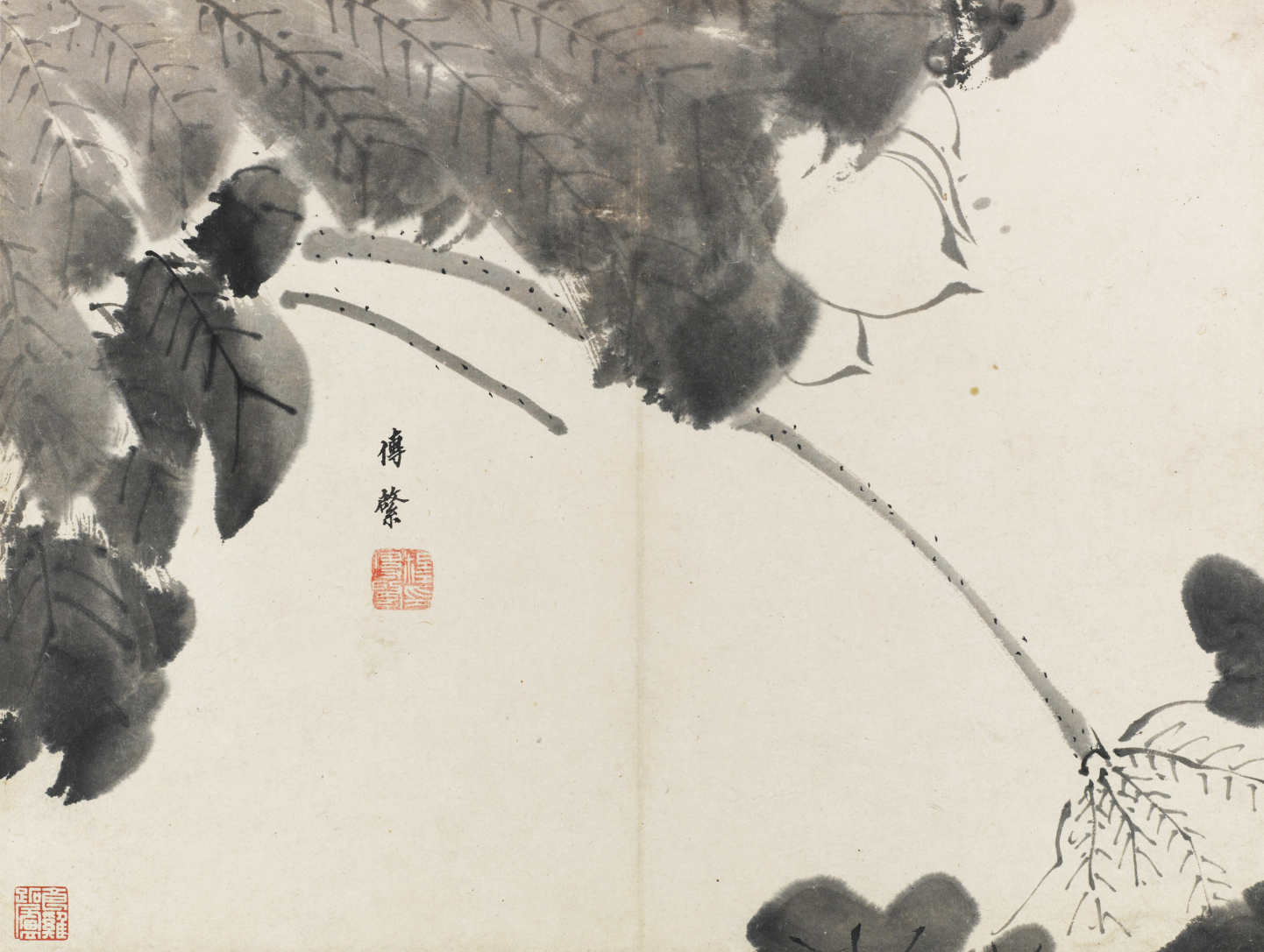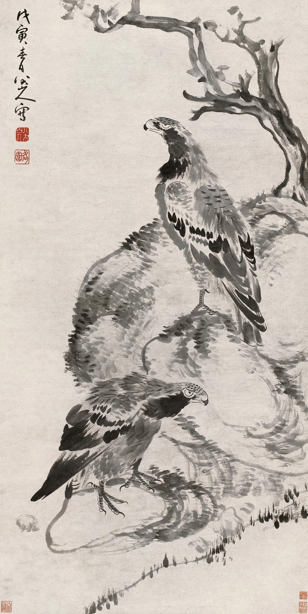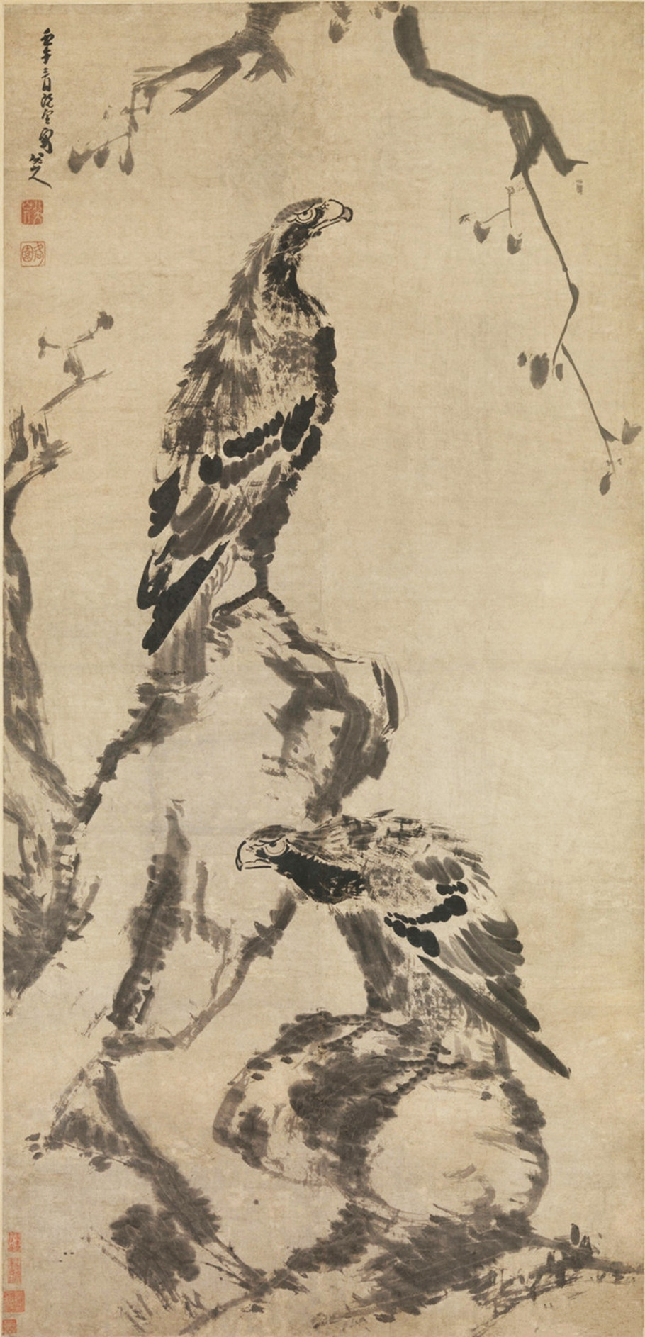 他是明太祖朱元璋第十七子朱权的九世孙,本是皇家世孙。明亡后削发为僧,成了亡命之徒,后改信道教,住南昌青云谱道院。擅书画,花鸟以水墨写意为主,形象夸张奇特,笔墨凝炼沉毅,风格雄奇隽永;山水师法董其昌,笔致简洁,有静穆之趣,得疏旷之韵。擅书法,能诗文,用墨极少。朱耷一生坎坷,曾一度精神失常,痛定思痛后,他选择背过身去,与世隔绝,在创作中安放自己孤独的灵魂。用他自己的话说,“墨点无多泪点多,山河仍是旧山河。横流乱世杈椰树,留得文林细揣摹。”