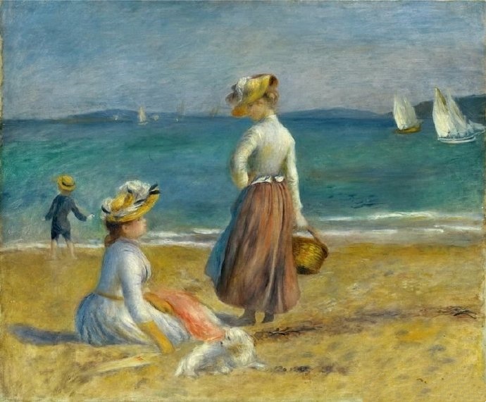 这是一幅华丽张扬的迷人作品,描绘的是人们在灿烂的阳光下尽情享受大自然的舒适惬意。两位穿着漂亮服装的年轻妇女在一只白色长毛狗的陪伴下,正享受着海面吹来的清风。左中部的海滩上站着一个小男孩,好像正要往微波荡漾的海面扔一块小石子,远处则是漂在海上的帆船。19世纪90年代,雷诺阿放弃了印象派的标志性美学特征,即像速写一样随意的即兴创作风格。他开始追求一种更加注重构图、更加古典的风格。这一倾向在这幅作品中表现得十分明显。画面中两位女性的姿势和轮廓都体现出清晰的线条感,让人联想起希腊罗马式的浮雕作品。在沙滩、大海和蓝天组成的淡色背景的衬托下,他们的轮廓显得尤其清晰明朗。中间站立着的女子是沙滩、海、天三者连接的纽带,她就像引线一样使整个构图融为一体。画面中三个人物组成的一个三角形,以及两个女子与小狗组成的另一个三角形,使得整个构图更具稳固性。画面看似随意而又优雅,实际上雷诺阿在创作时花费了大量的心思。
