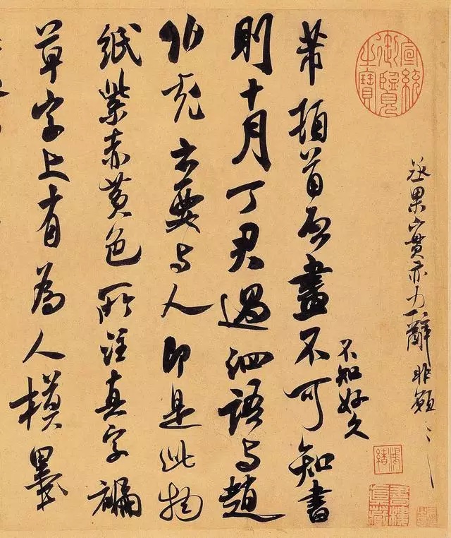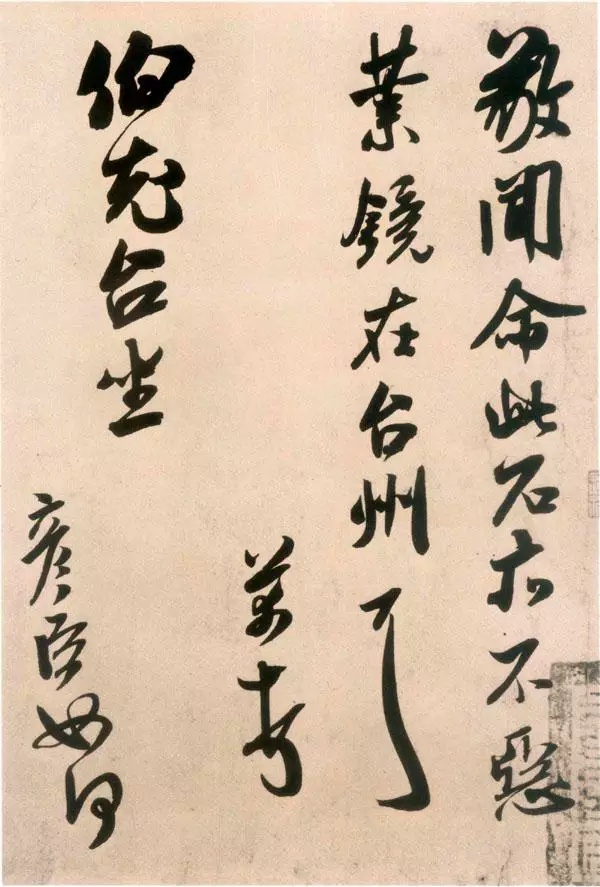翰牍九帖之二 纸本 行草书 纵25.4厘米 横43.2厘米 台北故宫博物院藏。 【释文】:(前补书:丞果实,亦力辞,非愿非愿) 芾顿首启:画不可知(旁注:不知好久),书 则十月丁君过泗,语与赵 伯充,云要与人,即是此物。纸紫赤黄色,所注真字,褊 草字,上有为人模墨 透印损痕。末有二字: "来戏",*才字也。告留。念其 直就本局虞候拨供给 办。或能白 吾老友吾舍人,差两介送 至此,尤幸尤幸!再此。芾顿首上, 伯修老兄司长。…… 不记得也。存纸尾。 《晋纸帖》 翰牍九帖之三,纸本,行草书, 纵23.7厘米,横39.1厘米。 台北故宫博物院藏。 【释文】:此晋纸式也,可为之。越竹千杵裁出,陶竹乃腹不可杵,只如此者乃佳耳。老来失第三儿,遂独出入不得,孤怀寥落,顿衰飒,气血非昔。大儿三十岁,治家能干,且慰目前。书画自怡外,无所慕。芾顿首。二曾常见之,甚安。 《适意帖》 又称《玉格帖》 翰牍九帖之四,纸本,行草书, 纵23.5厘米,横35.9厘米。 台北故宫博物院藏。 【释文】:百五十千,与宗正争取苏氏《王略帖》(旁注:右军),获之。梁、唐御府跋记完备。黄秘阁知之,可问也。人生贵适意,吾友觑一玉格,十五年不入手,一旦光照宇宙,巍峨至前,去一百碎故纸,知他真伪,且各足所好而已,幸图之!米君若一旦先朝露,吾儿吝,万金不肯出。芾顿首。 《贺铸帖》 翰牍九帖之五,纸本,行草书, 纵23.4厘米,横36.8厘米。 台北故宫博物院藏。 【释文】:芾再启。贺铸能道行乐慰人意。玉笔格十袭收秘,何如两足其好。人生几何,各阏其欲。即有意,一介的可委者。同去人付子敬二帖来授,玉格却付一轴去,足示俗目。贺见此中本乃云公所收纸黑,显伪者。此理如何,一决无惑。芾再拜。 米芾《丹阳帖》 翰牍九帖之六,纸本,行草书, 纵23.5厘米,横22.8厘米。 台北故宫博物院藏。 此帖所致为米芾之友人。此友人乃《适意帖》中“觑一玉格,十五年不入手”之“吾友”。 【释文】:丹阳米甚贵,请一航载米百斛来,换玉笔架,如何早一报,恐他人先。芾顿首。 《丹阳帖》,《书法大辞典》称为《丹阳帖》;蔡舜宁《米芾之书学思想与书法艺术研究》称为《换玉笔架书》。“丹阳”乃润州古称。秋榖未登,青黄不接,米价必至踊贵,故此帖必作于崇宁二年夏秋之间。米芾愿以玉笔架换百斛丹阳米,寥寥二十余字,“如何”二字是商量的口气,有点调皮;“早一报,怨他人先”,则活脱可见其幽默诙谐。从文字看来,已有《世说新语》中晋人名士风度。此帖文字较少,虽是行书,但全帖完整,显得净洁可爱。 《致伯充尺牍》又称《业镜帖》 翰牍九帖之七(二帖),纸本行草书, 纵23.5厘米, 横21.6厘米, 台北故宫博物院藏。 【释文】:敬闻命。此石亦不恶。业镜在台州耳。芾顿首。伯充台坐。彦臣如何? 《伯充帖》 又称《致伯充尺牍》 翰牍九帖之七(二帖),纸本。 纵27.8厘米,横39.8厘米。信札一则。 台北故宫博物院藏。 【释文】:十一月廿五日。芾顿首启。辱教。天下第一者。恐失了眼目。但怵以相知。难却尔。区区思仰不尽言。同官行。奉数字。草草。芾顿首伯充台坐。 米芾《惠柑帖》