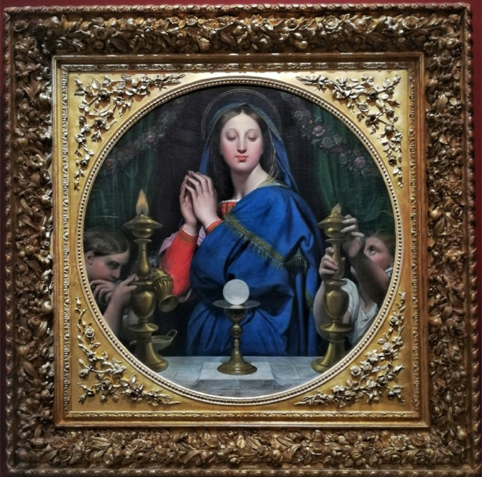 这幅《圣母崇拜》直译为《主持的圣母玛利亚》(The Virgin Adoring The Host),是安格尔线条美的代表作之一。安格尔说“线条就是一切,色彩是空虚的”,“色彩是绘画的装饰手段,线条为艺术的本质”,这是他在艺术创作中坚定不移的美学观。安格尔在艺术上不仅是西方正统学院的范本,对印象主义的德加、雷若阿,甚至对毕加索也有影响。他的艺术可通过拉菲尔上溯到古代希腊,可以说他是描绘女性美的集大成者,后人无人能望其项背。