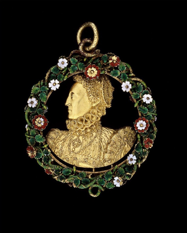 尼古拉斯·希利亚德,《凤凰珠宝》,伊丽莎白一世剪影金质奖章,珐琅边框,伦敦(英格兰),约1570–1580年。