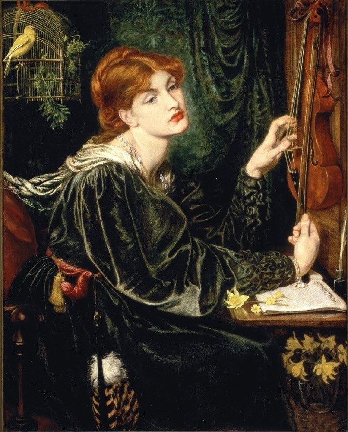 英国拉斐尔前派大师罗塞蒂,“维罗妮卡.维罗纳”,1872年,特拉华州美术馆藏。回到屋里的她,一身高贵典雅的绿色天鹅绒衣裙,无聊拨弄着琴弦,陷入沉思,耳边是笼外自由的画眉,欢快地歌唱,腕下压着的琴谱上摆着代表相思的黄水仙,她将如何谱写自己的乐章?