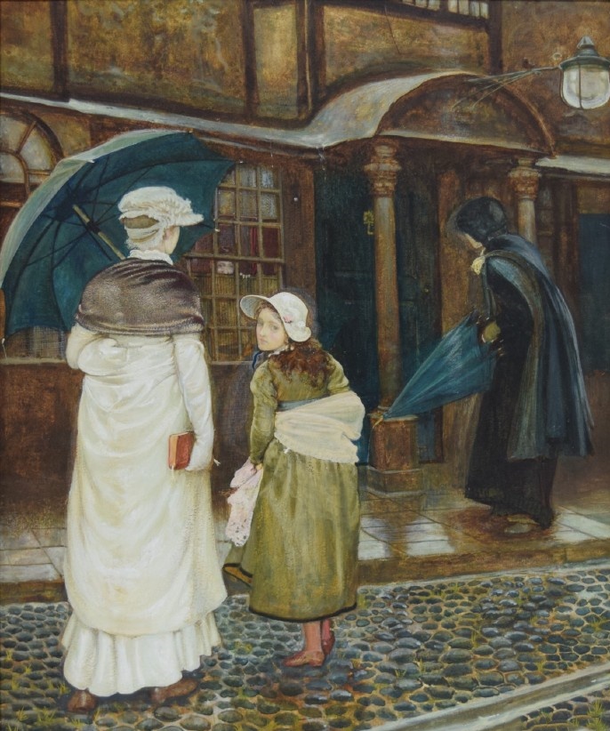 英国拉斐尔前派大师休斯,“下雨的星期天”,1872年。他对细节的刻画,已经仔细到入魔的程度:屋檐上汩汩泻下的水柱、撑开的雨伞伞骨淌下的水流、雨伞收拢伞尖滴下的水滴、水泥地面鹅卵石道薄薄的一层积水如镜面般反光都被他描绘得细致入微;画中间正回观瞧的小女孩,脸上露出淡淡的忧伤,成为统治画面的精神内核……