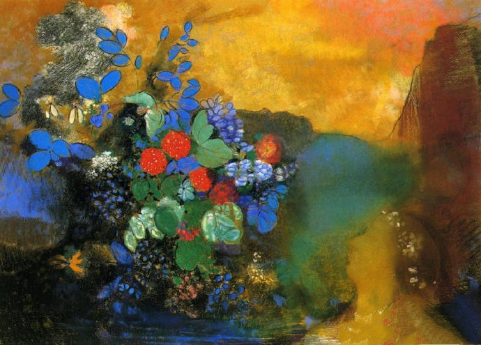 法国象征主义大师雷东,“奥菲丽亚的精神世界”,1905年。该作很有特色,主题的她隐退到边角,色彩成为真正主角:忧郁的钴蓝和亢奋的铬黄占据了整个画面,展现出她极度悲伤、压抑到疯狂的精神世界