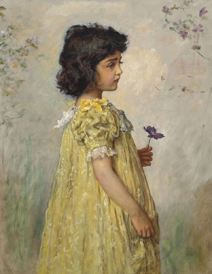 这幅画描绘了一个身穿黄色长裙的小女孩,侧身站立,手中拿着一朵紫色的花朵,眼神若有所思地望向远方。