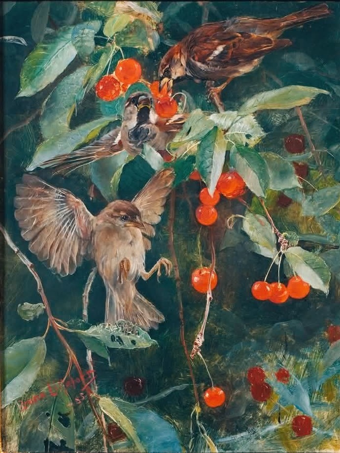 樱桃树上的麻雀 1885, Bruno Liljefors (瑞典, 1860-1939)
