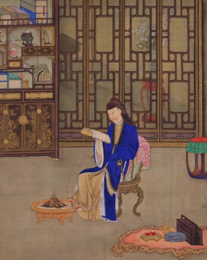 胤禛(雍亲王)手捧书册专心阅读,足下是热气腾腾的火炉。