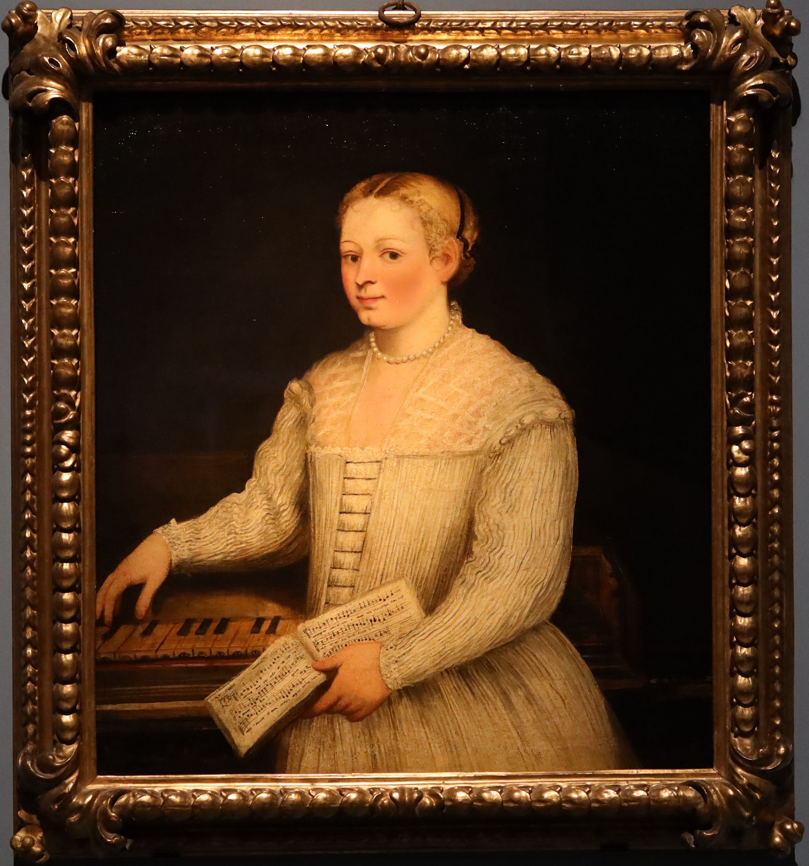 玛丽埃塔 · 罗布斯蒂是大名鼎鼎的威尼斯画家雅各布·罗布斯蒂(又名丁托列托)的长女。丁托列托与一位可能拥有德国血统的女子生下玛丽埃塔,而她的样貌似乎佐证了这一点。自画像呈四分之三侧面角度展示,身材丰腴,一头金发精致优雅,白皙的皮肤透着红润光泽。画作并没有体现出玛丽埃塔从事绘画职业的特征,而是传达了这样的主题:一位有社会地位的年轻女子应受过良好教育,她所佩戴的珍珠项链即暗示着其地位。在这样的社会背景下,音乐在她的人生中扮演了重要角色。画中她的右前臂放在大键琴上,左手拿着一份乐谱。尽管其传记作者赞赏她的画技,称她一生精品无数,但迄今画家的其他作品无迹可寻。此外,据说她的父兄会让她在威尼斯的画室工作,玛丽埃塔为了不被认出会在父兄的要求下装扮成男性模样。