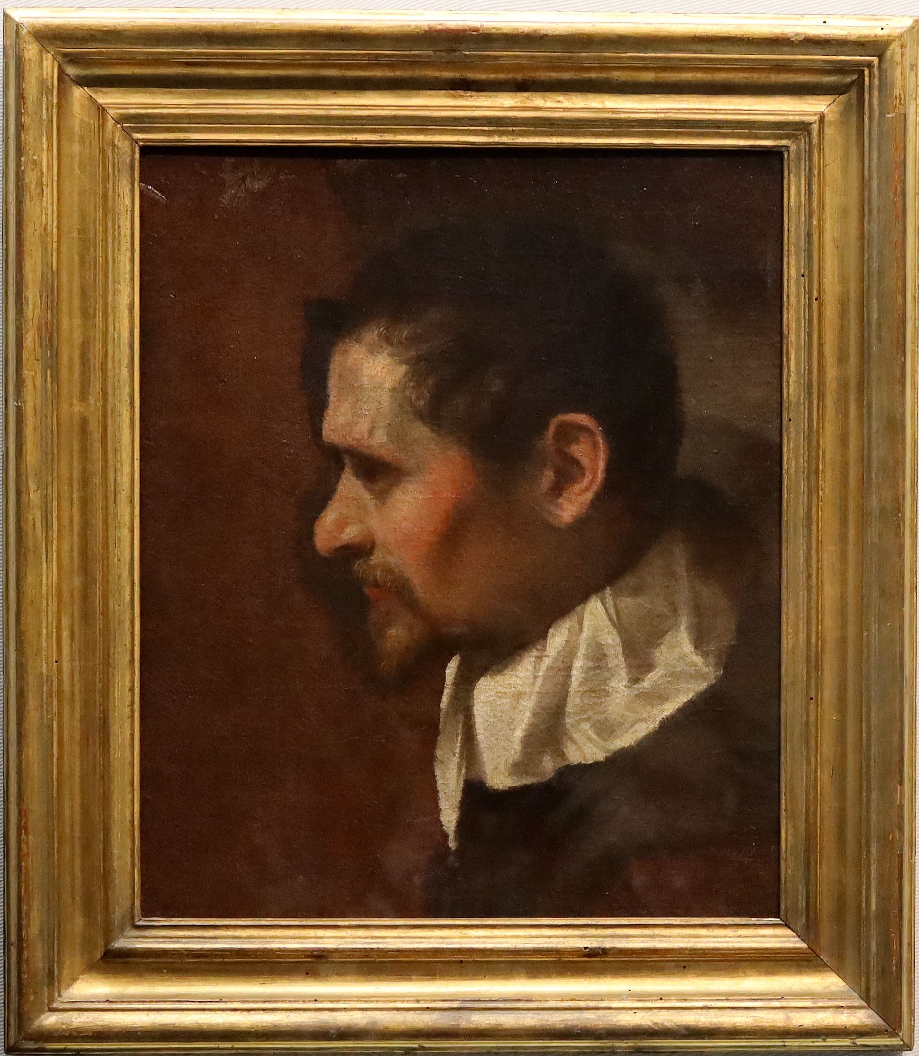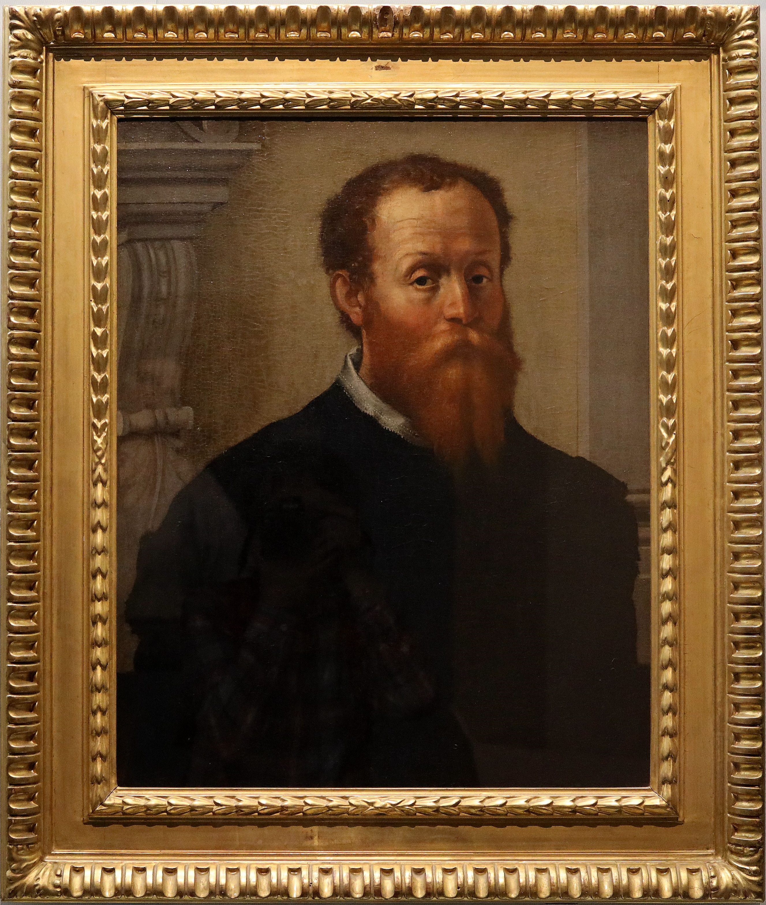 这是一幅中年男性的半身画像,红色络腮胡勾勒出面部轮廓,身着朴素的黑色外套和白色衬衫,领口处的刺绣清晰可见。背景是绘有渐进式阴影的浅色墙壁,墙壁左侧装有带楣梁的涡卷形壁饰,可能是壁炉或窗户的一部分,右侧是一根平滑的壁柱,这些都彰显出画家还作为建筑师的多重身份。