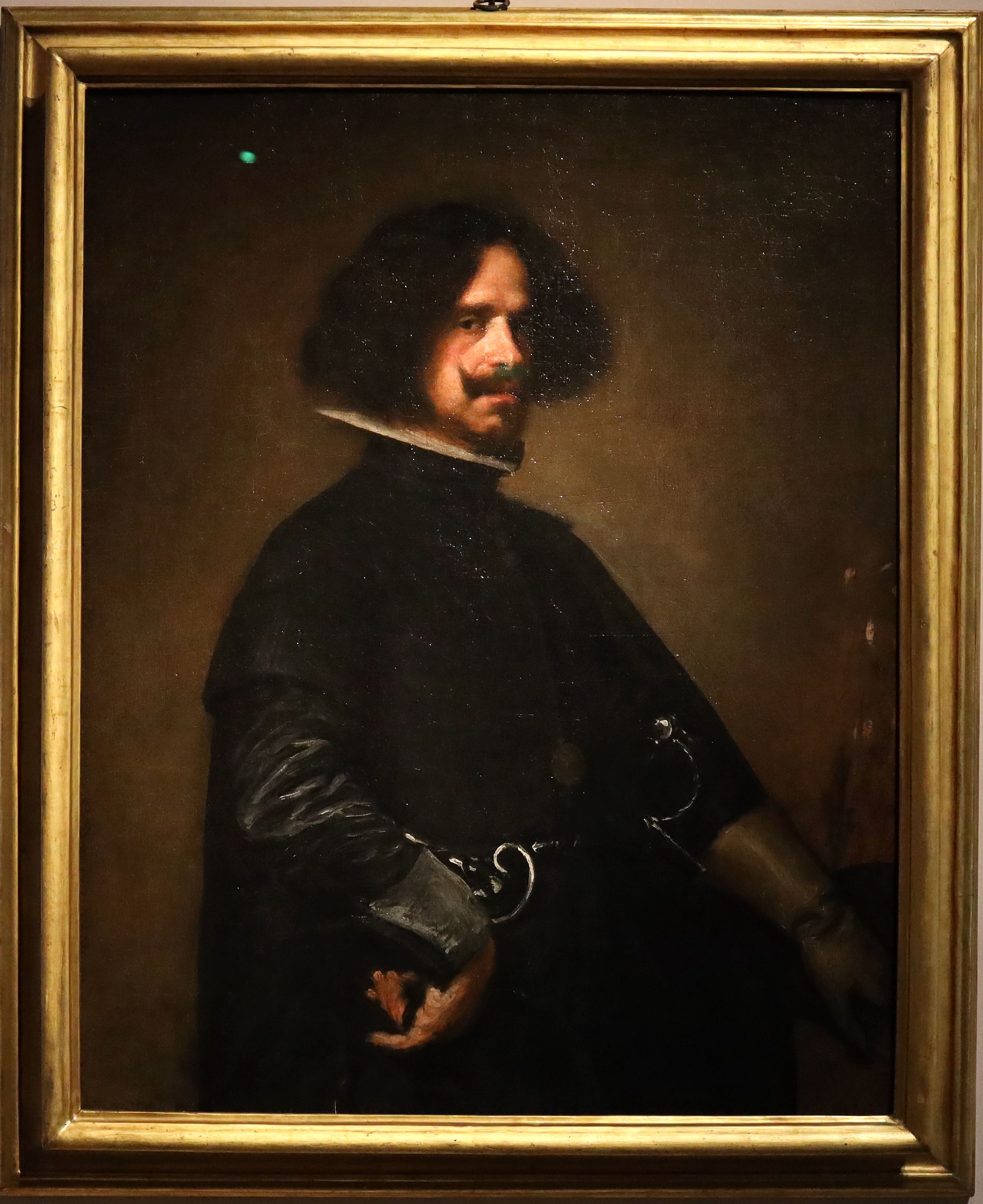 这幅自画像可追溯到委拉斯凯兹生命的最后十年,当时他蜚声国际,获得了崇高的社会地位,他的成就在西班牙是空前的。此后,他自称"伊达尔戈"—— 一种对西班牙贵族的尊称。为了达到庄严肃穆的效果,画家采用了一种类似摄影的表现技巧,从非正面仰角描绘,使人物似乎傲慢逼视着观众从而体现其威严。他的笔触迅疾笃定,既有完成度极高的部分,又有一笔带过的部分,使观众从中感受到技术娴熟、经验丰富的画家流露出的大胆与自信。画作昏暗的色调中有银光闪现,那是贵族骑士的宝剑和一把能打开皇室大门的钥匙,暗示了1652年国王授予艺术家的尊贵无比的"皇宫高级内侍"头衔。