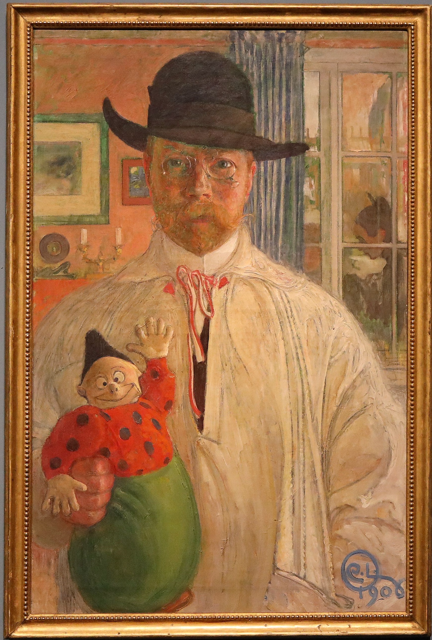 而他性格的阴暗面只有在1931年去世后出版的传记中才得以揭示,被概括为"我总是微笑着的脸庞,隐藏生命中的恐惧",这幅1912年捐赠予乌菲齐美术馆的1906年的自画像正体现了这一点。画作名为《自查》,背景设置在位于松德博恩的画室。画家一边对着镜子观察自己,一边拿着一个微笑的玩偶,这个小丑模样的玩偶可以理解为画家的另一个自我,或者根据他人的说法,玩偶是他的伙伴,它的笑脸隐藏了拉森的悲观。
