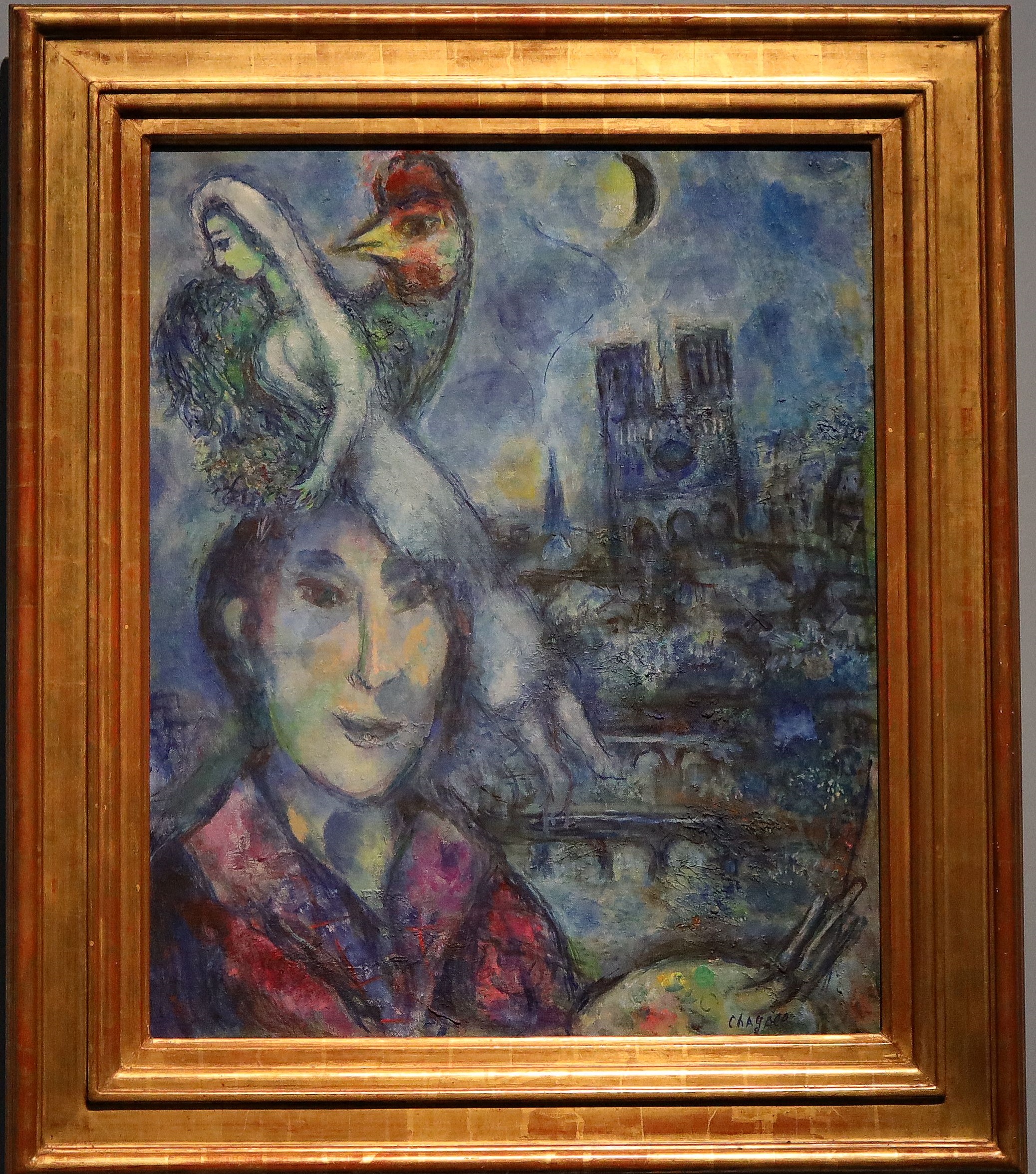 在马克.夏加尔漫长的职业生涯中共创作了三十多幅自画像,乌菲齐美术馆收藏的这幅也许是其中最令人回味的。自1959年起直至1968年,该作品历时九年才得以完成,它既是对法国的致敬,也是对生命的歌颂。画作背景是梦幻的巴黎,埃菲尔铁塔、巴黎圣母院和塞纳河都清晰可辨,夏加尔本人则将自己描绘成一位穿着睡袍的画家。拥有杏核眼和高颧骨的人物面部构成了作品的视觉中心,画家头顶上标志性的"新娘"和"公鸡"十分显眼。画中新娘应是夏加尔的第一任妻子贝拉,她在20世纪40年代就过早离世,画家的绘画灵感都来自对她的记忆。用公鸡和新娘表达希望和繁衍,两者分别代表男性和女性的生命力。这一象征手法也在背景中重现,金黄色的太阳和黑色的弯月奇迹般地照耀着同一片天空。