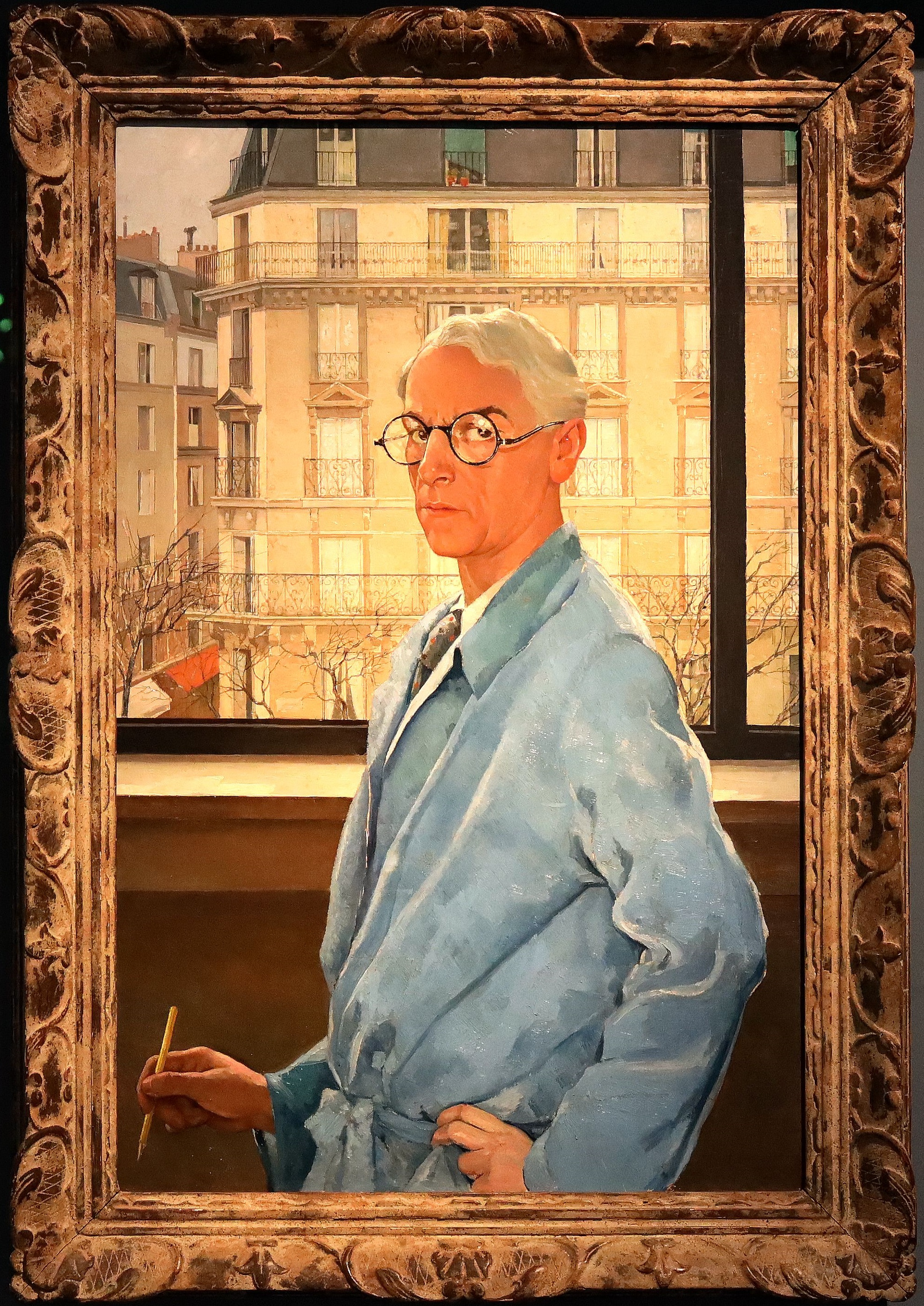 此画作于1936年,布鲁内莱斯基57岁,正处于事业巅峰期。他站在巴黎工作室窗前,以自豪的姿态与骄傲的神情表现自己作为一名成功的画家、插画家和舞美设计师的身份。艺术家以四分之三侧身姿势站立,一只手搭在髋部,让人联想到以往经典的肖像画作品。作品中还展现了关于图像志的研究,比如画家手中的毛笔,彰显出他作为艺术从业者的多才多艺。