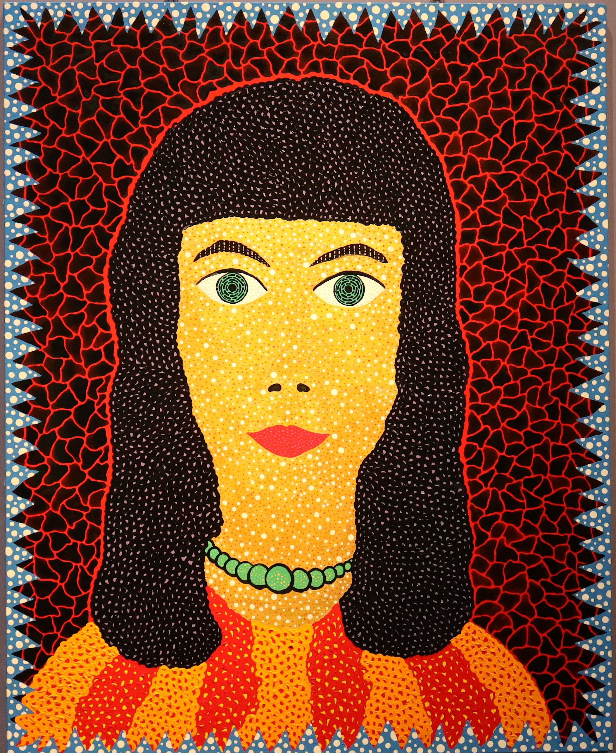 在这幅自画像中,草间弥生将自己展现为超越俗世教条,永不屈服的形象。通过日本漫画般的、充满色彩与魔力的凝视,她再次使用最具特色的圆点构建自己的脸庞和上半身,搭配画作背景里的网格状图形,这种图形就像她所说的那样:"我从小时候就开始······喜欢用锤子打碎玻璃、镜子和盘子"。支离破碎的内心世界被粘合在一起,在画框里重新组合,这是草间弥生作为一位艺术家,通过一种非常特殊的、自由的表达,找回自己内在秩序的唯一方式。