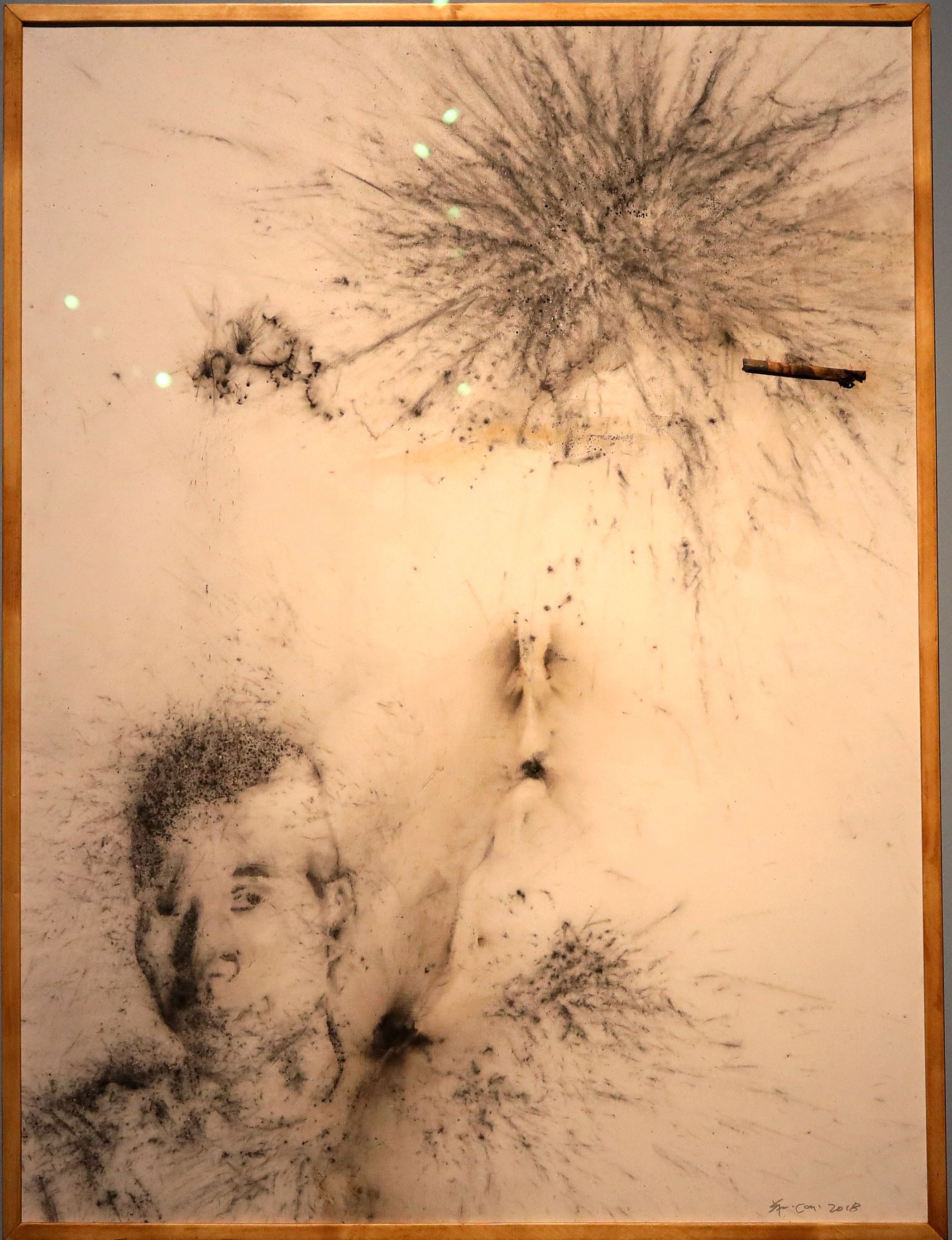 蔡国强作为中国最著名的当代艺术家之一,他勇于打破常规,使用火药作为创作媒介,凭借其在世界各地展现的瑰丽壮观的烟火表演而蜚声国际。这些表演都以照片、视频和纪录片的形式被保存了下来。这幅自画像的标题就明了艺术家对火药的运用,而蔡国强的肖像则以一种非常经典的方式展现,人物呈正面姿势,抬眼望着位于画布右上角他的专属创作工具——并非画笔或调色板,而是一个爆炸的小型烟花。这幅作品由中国收藏家曹其峰在2018至2019年蔡国强举办"花曲"个人展览期间捐赠给乌菲齐美术馆。展览"花曲"是艺术家2017至2019年"一个人的西方艺术史之旅"项目的一部分,蔡国强打算通过这个项目在欧洲重要的博物馆机构里,与其馆藏所代表的,与之不同的西方艺术史展开对话。