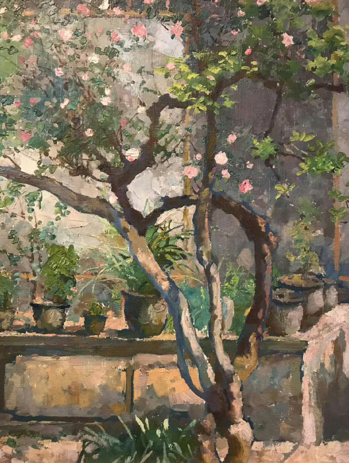 《庭院》描绘的是中国边疆云南鸡足山的一座庙宇,画面中的屋舍呈现出中国最常见的灰色调。徐悲鸿在这幅画中运用了他特有的色彩处理手法,通过调和多种颜色形成“脏”色调,使画面显得更加丰富而富有层次感。