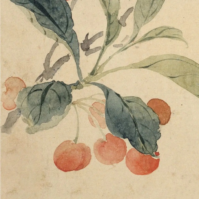 画中樱桃色泽如旧。以没骨法点染的樱桃叶,形态各异,疏密有致。淡然的天真,仿佛被时光凝驻。