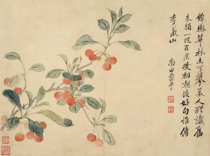画意和题诗,借用了李商隐《嘲樱桃》诗中典故:“朱实鸟含,青楼人未归。南园无限树,独自叶如帏”。