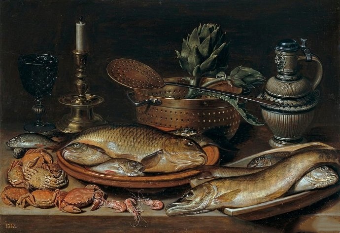 图4,Clara Peeters作于1611年的静物画,Still Life with Fish, Candle, Artichokes, Crabs and Shrimp。