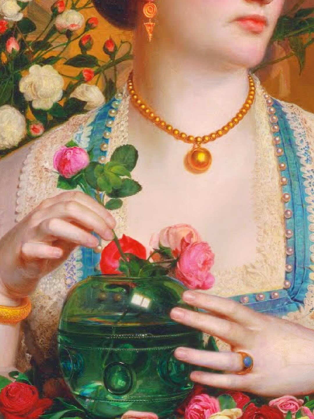 画中的女子静立于暖色的东方屏风前,仿佛一尊被时光浸染的象牙雕塑。腕间古罗马式的金镯与颈项间层叠的金色圆珠项链彼此低语,每一次微光流转,都像在诉说着古老文明的温度。无名指上那枚绿松石戒指,如一泓清泉悄然停驻,与她那蓝宝石般的眼眸遥相呼应。
