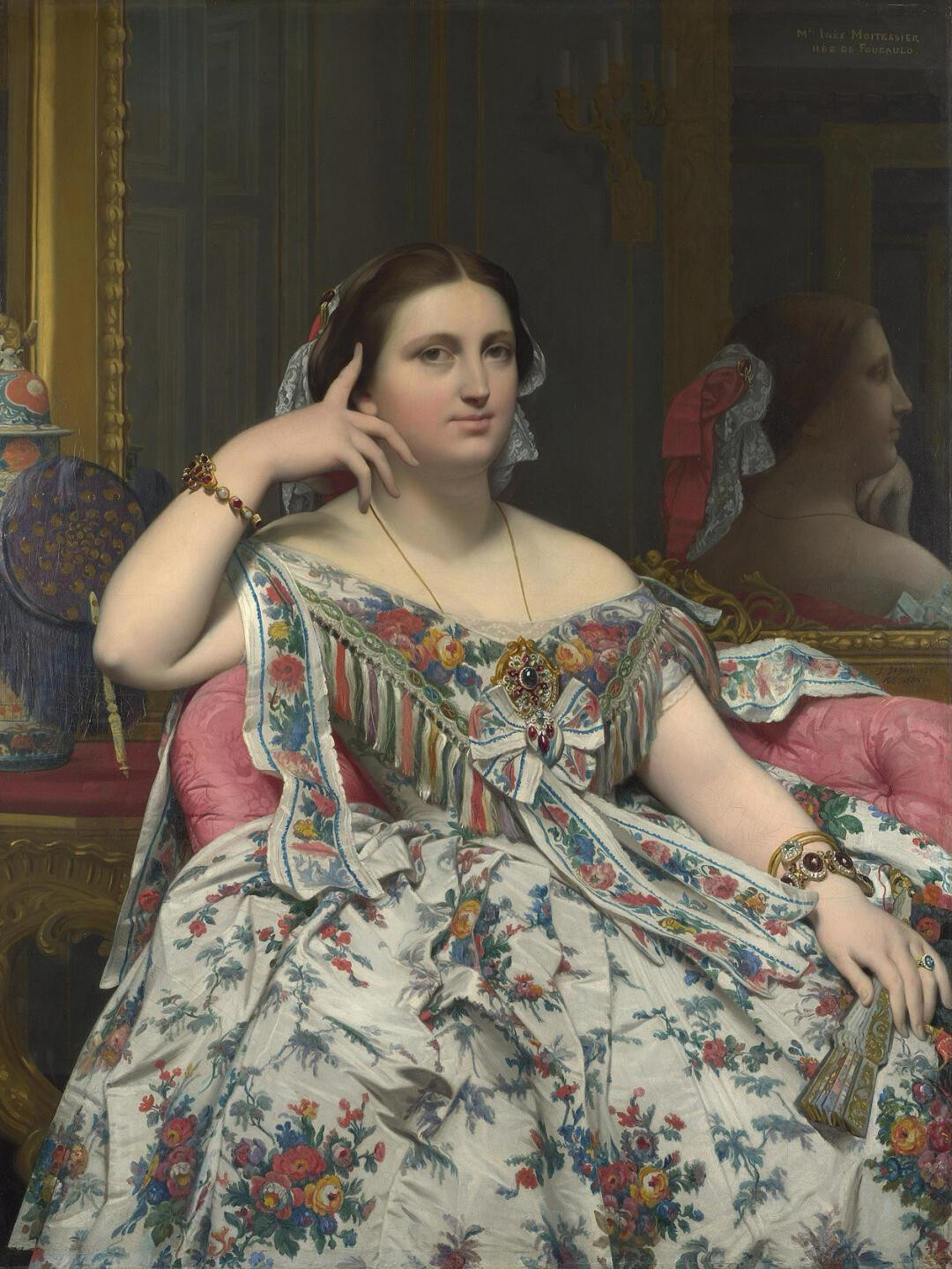 画中的墨瓦特雪夫人是一位财富万买的烟草商夫人,社交界的名人。她身着纹路繁复的丝缎礼服,腕间佩戴暗红色宝石手链,如同沉默的火焰。