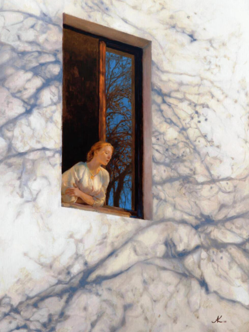 画布上的一面白墙被一面窗户分割,阳光透过窗外摇曳的树枝,在洁白的墙面上投下细碎斑驳的光影。一位白衣少女倚窗而立,金橙色的长发在阳光下泛着温暖的光晕,她微微倾身向外,纯白的衣衫被微风轻拂,安静地凝视着窗外的景致,恬静而美好。
