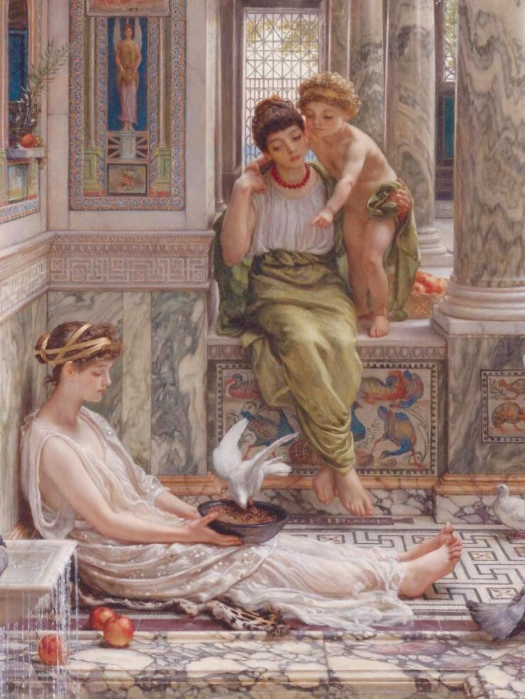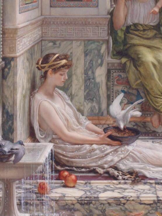 身着轻盈纱袍的女子优雅地倚靠在古罗马风格的庭院廊柱旁。她手持食碗,引来一群鸽子振翅飞来。画家以惊人的细节再现了古罗马别墅的奢华景致——精雕细琢的大理石柱廊、繁复的装饰纹样,营造出宁静而奢华的氛围。整个场景沐浴在地中海明媚的阳光下,将古典时代的闲适优雅与自然生机完美融合。