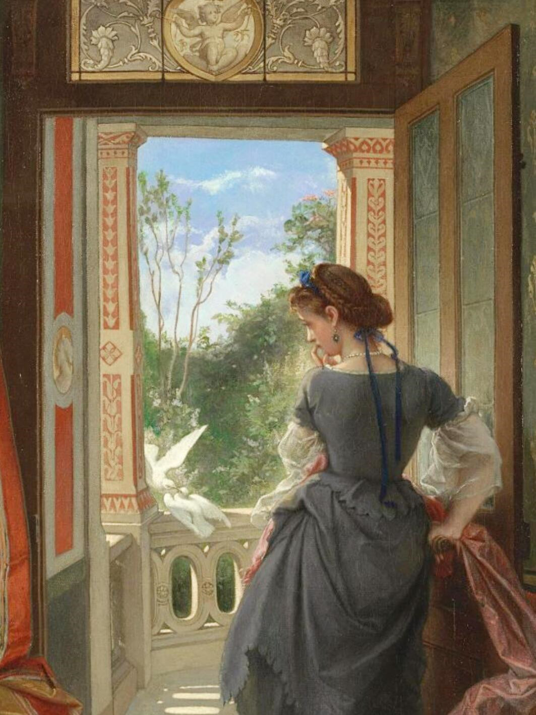 身着灰色长裙的少女伫立窗边,静静凝视窗边一对展翅的比翼鸟。阳光透过枝叶,洒落在它们洁白的羽翼上,而少女低垂的目光中流淌着温柔的沉思。窗外绿意葱茏,生机盎然,与室内静谧的氛围形成微妙对比,仿佛将“比翼双飞”的诗意与少女内心的涟漪悄然联结。