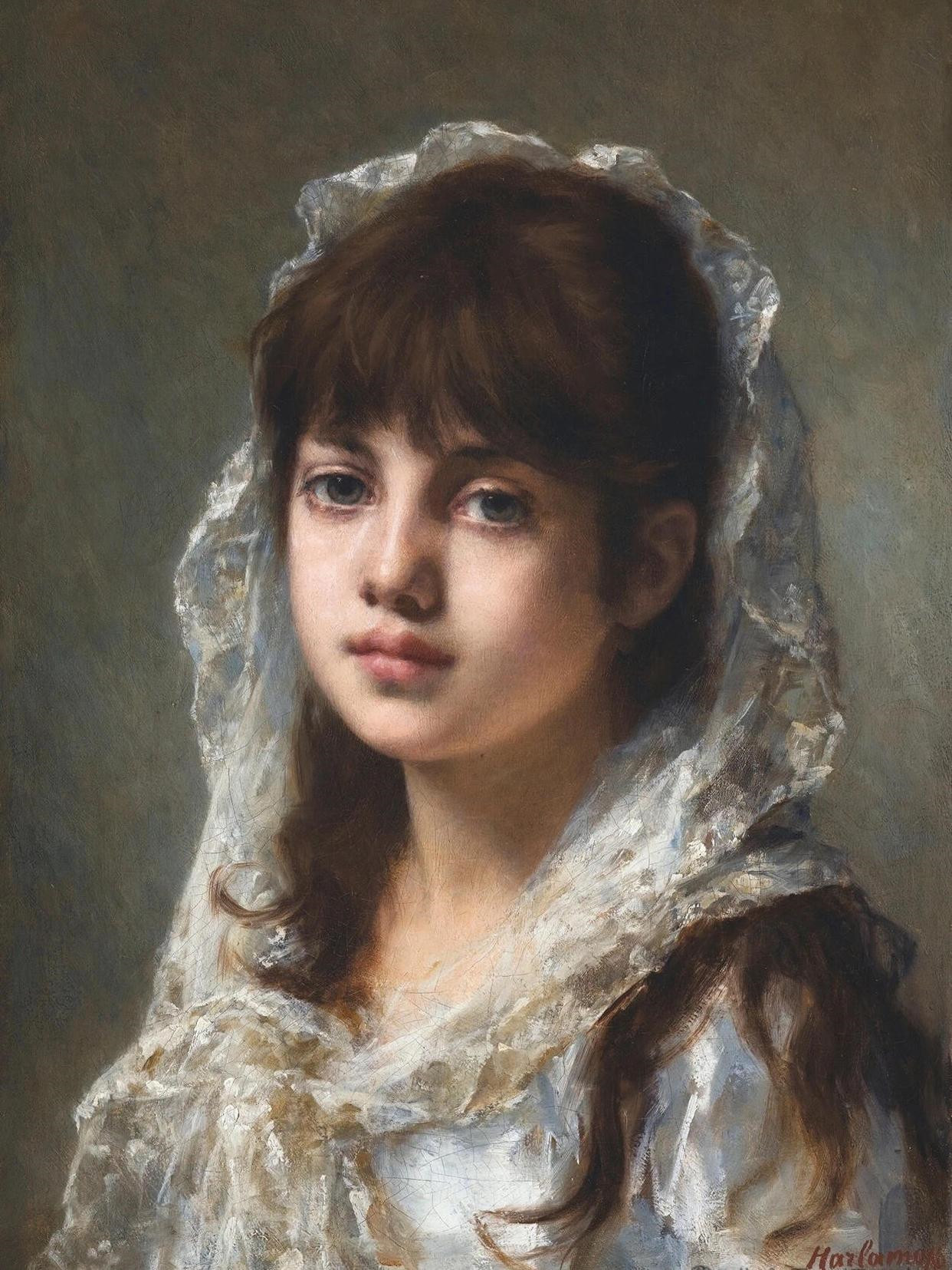 女孩披着银纱制成的头纱,仿佛披上一层皎洁的月光。清澈的眼睛里透着不谙世事的纯真,就像月亮的女儿,收到神明的庇护,在尘世间用纯净的心灵照亮世人的前路。