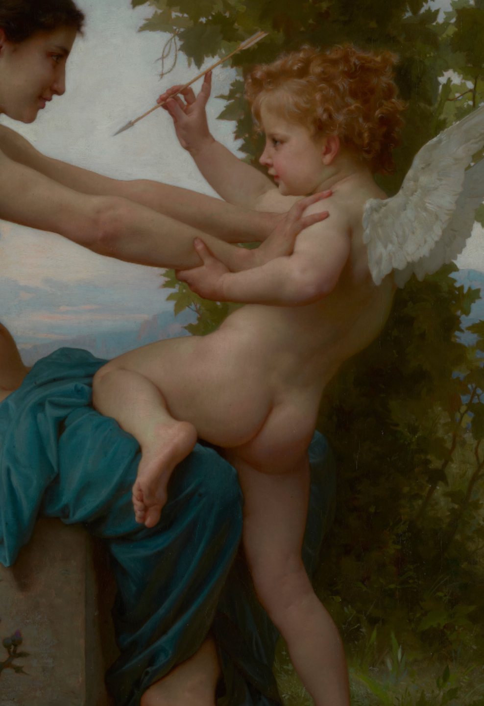 “史上最善于描绘爱情的画家”布格罗的画作《抵抗爱神的少女》将我数十年前内心深处的战争描绘得淋漓尽致。丘比特欲将爱情之箭插入少女的心脏,而少女正在用双手欲迎还拒地阻止他。然而他们之间的抗争与其说激烈,还不如说更像是一场游戏。丘比特足够伶俐却不以蛮力著称,但是少女此时并不像在全力推开他的模样。不,反而像是欣赏在身上纠缠耍赖的小朋友。