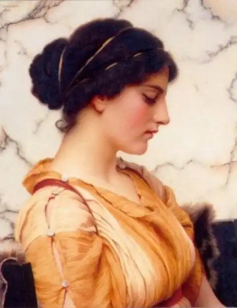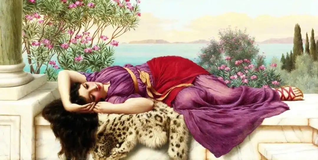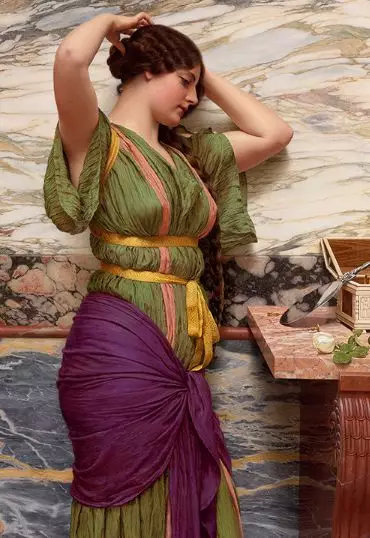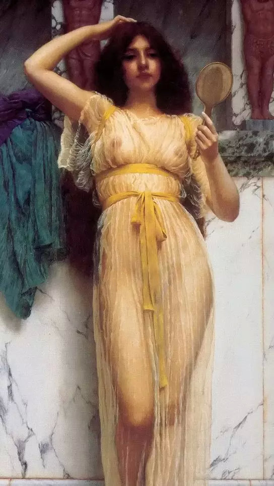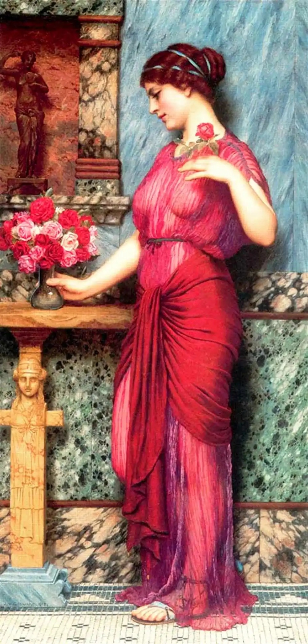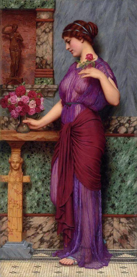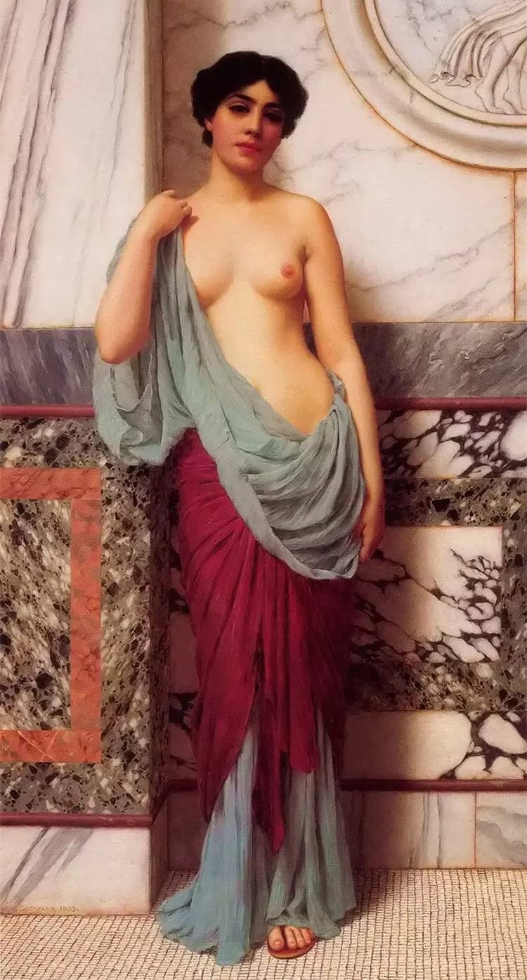 画家格维得以“拉斐尔前派”的风格与技巧,描绘了这位丰腴健美的罗马妇女,她赤裸上身,下着长裙,色彩沉稳,整个画面显示出一种对传统的仰慕,古典的严谨与理性,充满了冷静的画面。身材修长的罗马妇女,面容端庄,风韵十足,长裙曳地,显示优雅的风度。画家强调了色彩与造型的视觉美感,在写实的手法中融入了夸张与概括的形势因素。