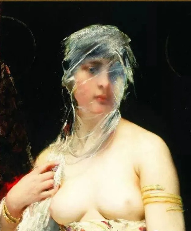 画的是一个带着薄薄面纱而胸部袒露无遗的女子。
