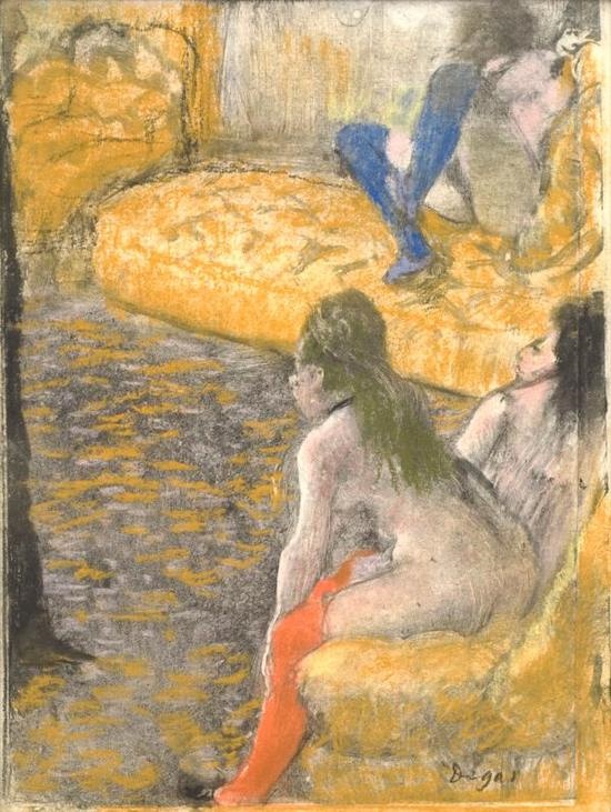 但他如此偏爱的芭蕾舞女,却纯洁、安全、静谧,似乎没有一点情欲。同时代的马奈也表示,“德加爱女人无能”。毕加索却不以为然,1917年,德加临终前,毕加索做了几幅德加逛妓院的肖像画,将德加刻画成一位疯狂的偷窥狂。这并不是恶意诽谤,因为德加在1870年代确实对巴黎一家妓院做了一系列偷窥记录,比如呈现妓院情景的印象派画作,这些都被毕加索收藏。可是德加笔下的妓院场景与19世纪晚期其他画家的并不相同。他画中的妓女们有时像舞女一样平静,悠闲地整理着衣服,或靠在座椅上休息;有时又表现得犹疑、焦躁,背部僵硬,脸部模糊。