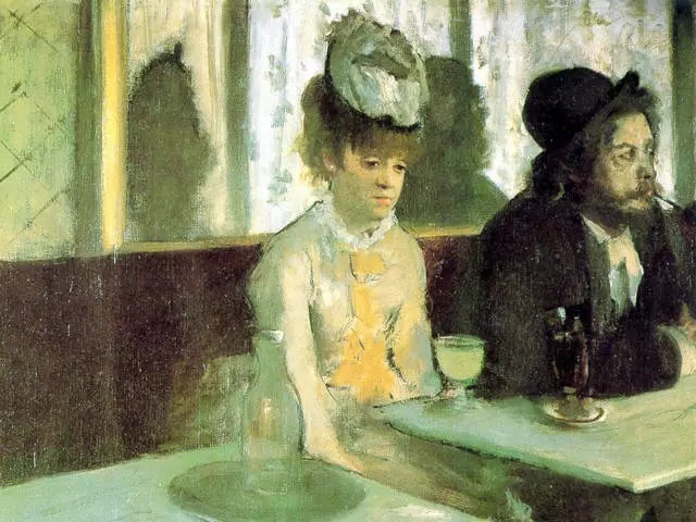 画面中,一男一女两人物被挤到右上角,一杯苦艾酒,反衬出两个失意人的精神状态。德加创造了一个个过度放纵生活的艺人和当代城市人难以忍受的惊人形象,这也是不同人生的状态,也可以说是不同的片段。