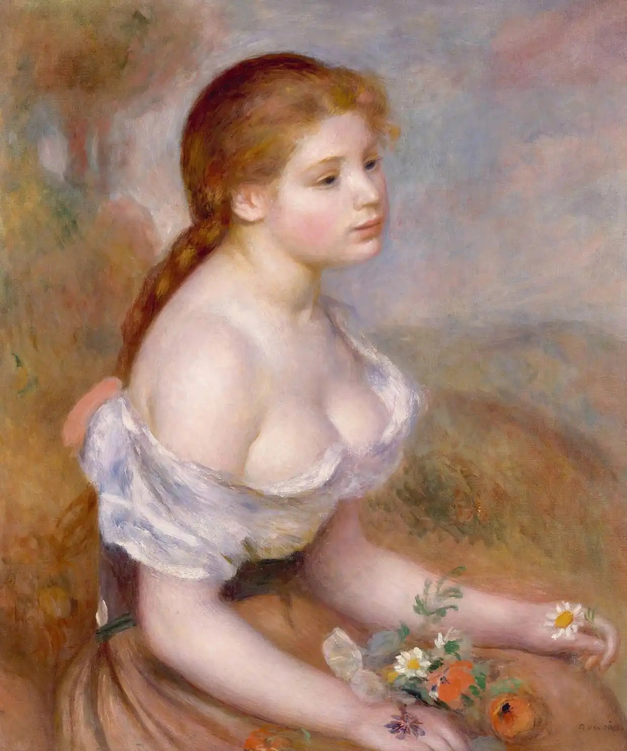 雷诺阿的画作始终强调“美”这一主题,而他眼中的美,往往与日常生活密不可分。这幅画中的少女没有繁复的服装或饰品,她自然披散的头发与简约的裙装让人感受到一种未经雕琢的纯真。她手中的雏菊象征着青春、纯洁与自然,这也正是雷诺阿想要表达的主题:生活中的美不必高贵奢华,而是真实且自然。