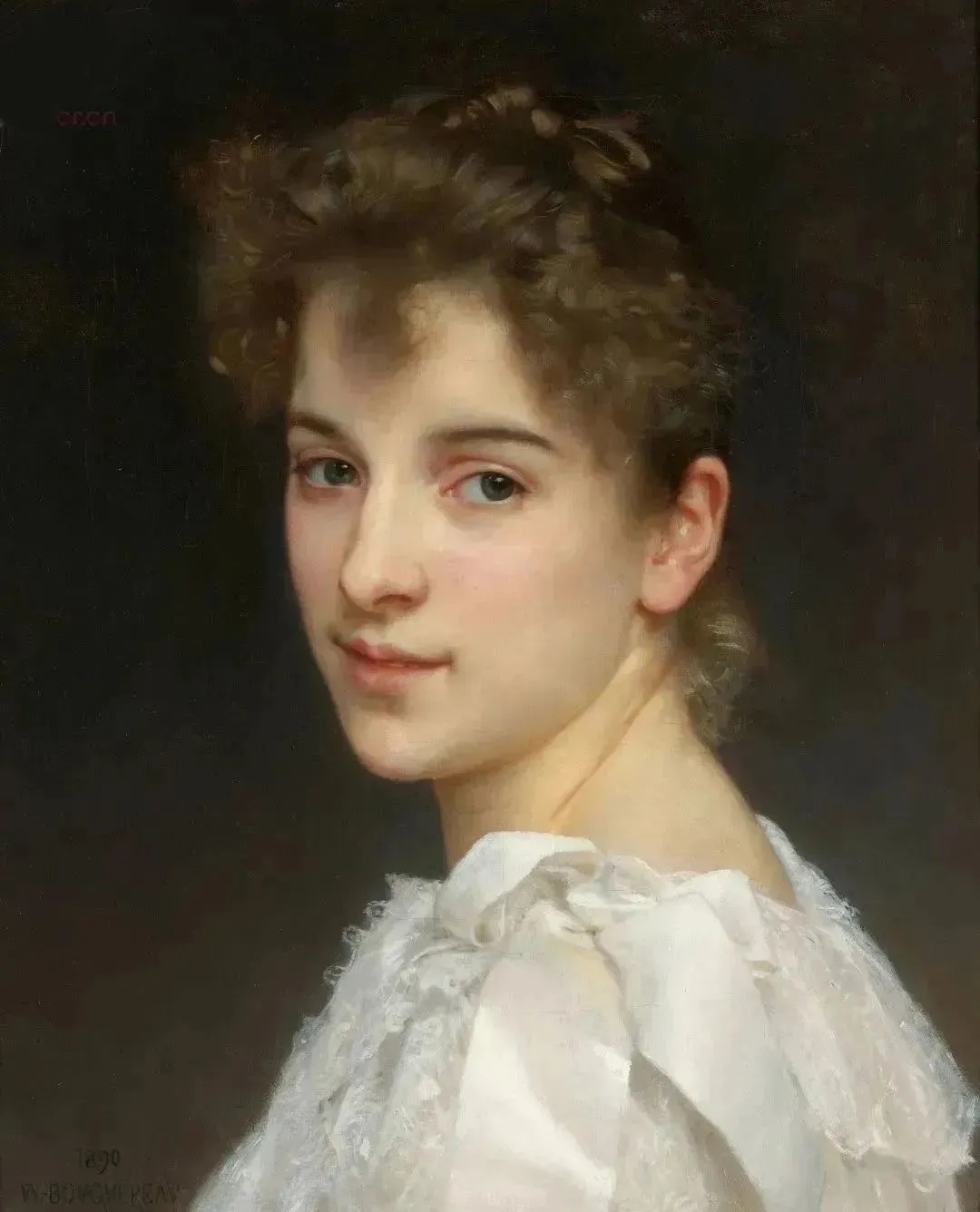 画中的女孩儿显露了四分之三的脸庞,在充足的光线下,有着非比寻常的美丽:微开的双唇、水汪汪的眼睛、修长直挺的鼻子,是那样的惹人注目。她眼带笑意注视着观画者。