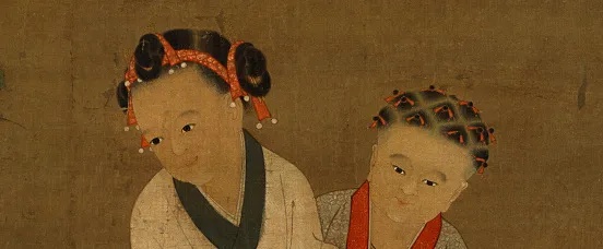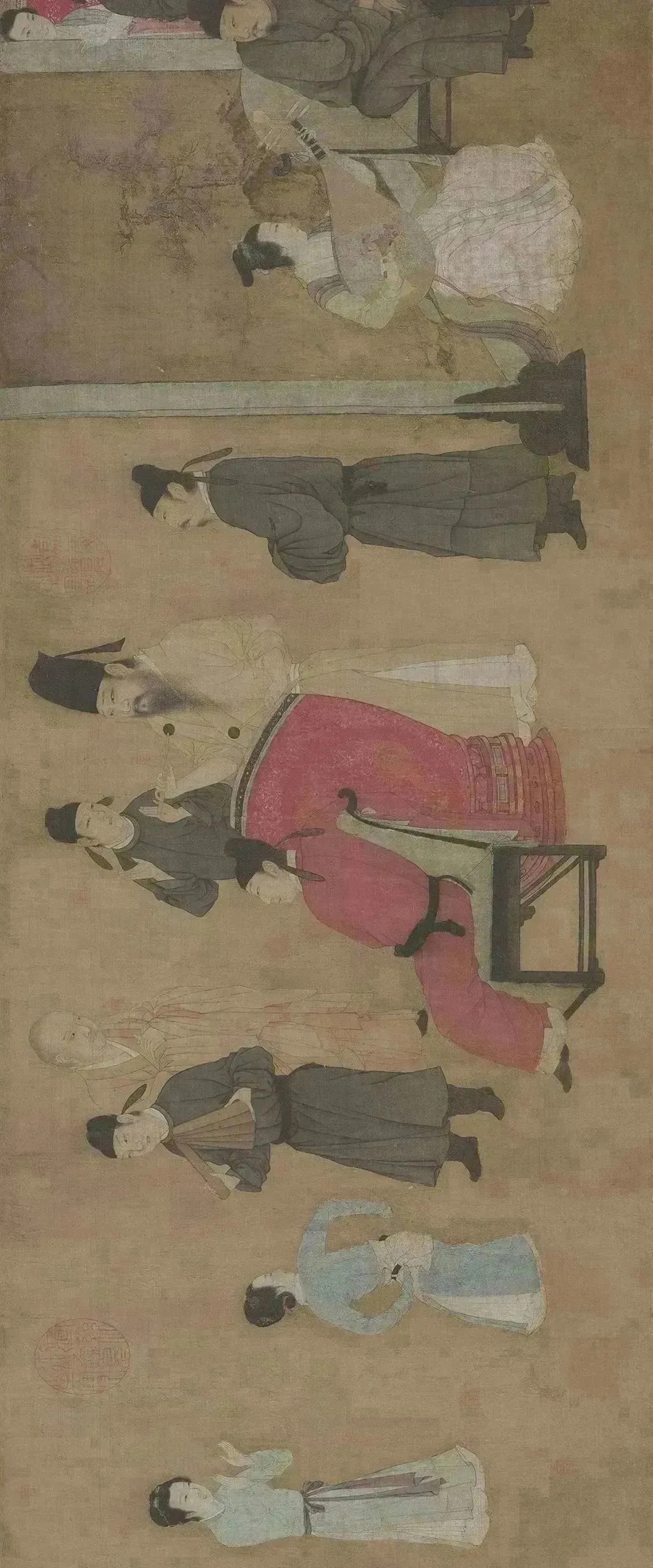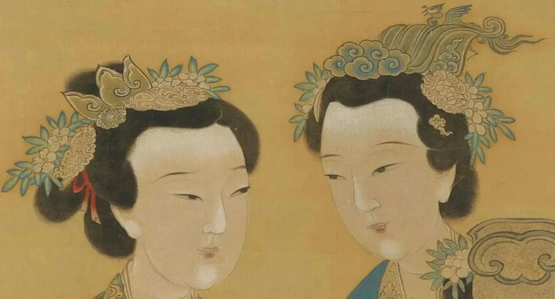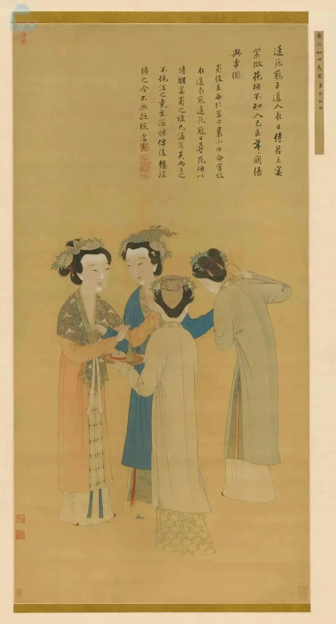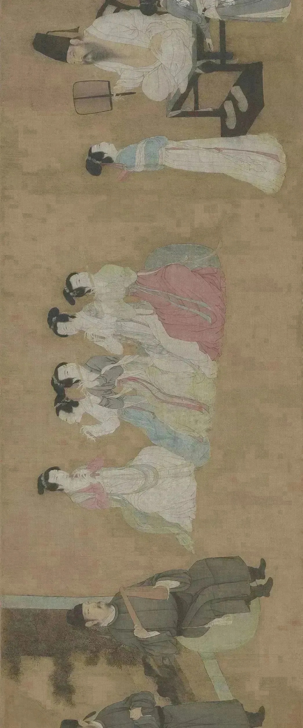 面向观者的两位仕女眼神对视,好似在交谈。画中仕女体态匀称优美,削肩狭背,柳眉樱髻,额、鼻、颇施以“三白”,既吸收了张萱、周昉创造的“唐妆”仕女造型特色,又体现出明代追求清秀娟美的审美风尚。四人交错而立,平稳有序,并通过微倾的头部、略弯的立姿和攀连的手臂,形成动态的多样变化和相互的紧密联系,加强了形象的丰富性和生动感。