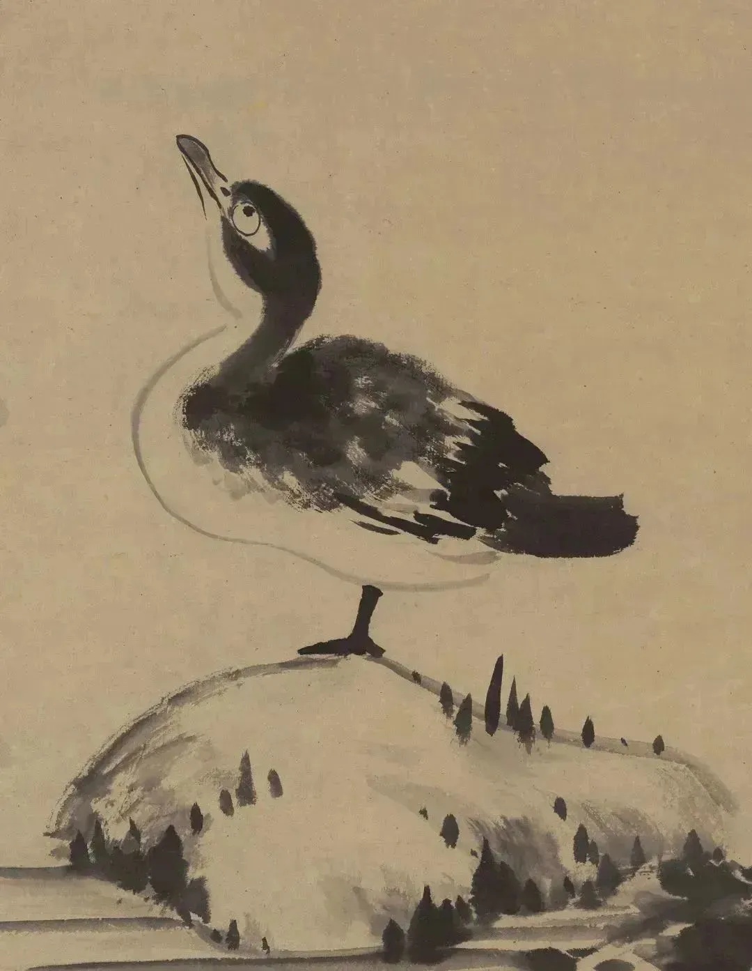朱耷是明室后裔,出身贵族,明亡清兴,他内心是不平衡的,所以他对社会不满,并在他的绘画当中表达了这种情绪,主要反映在所画动物的眼睛上,所以他画的鹿、鱼、鸟,大都是翻白眼的。