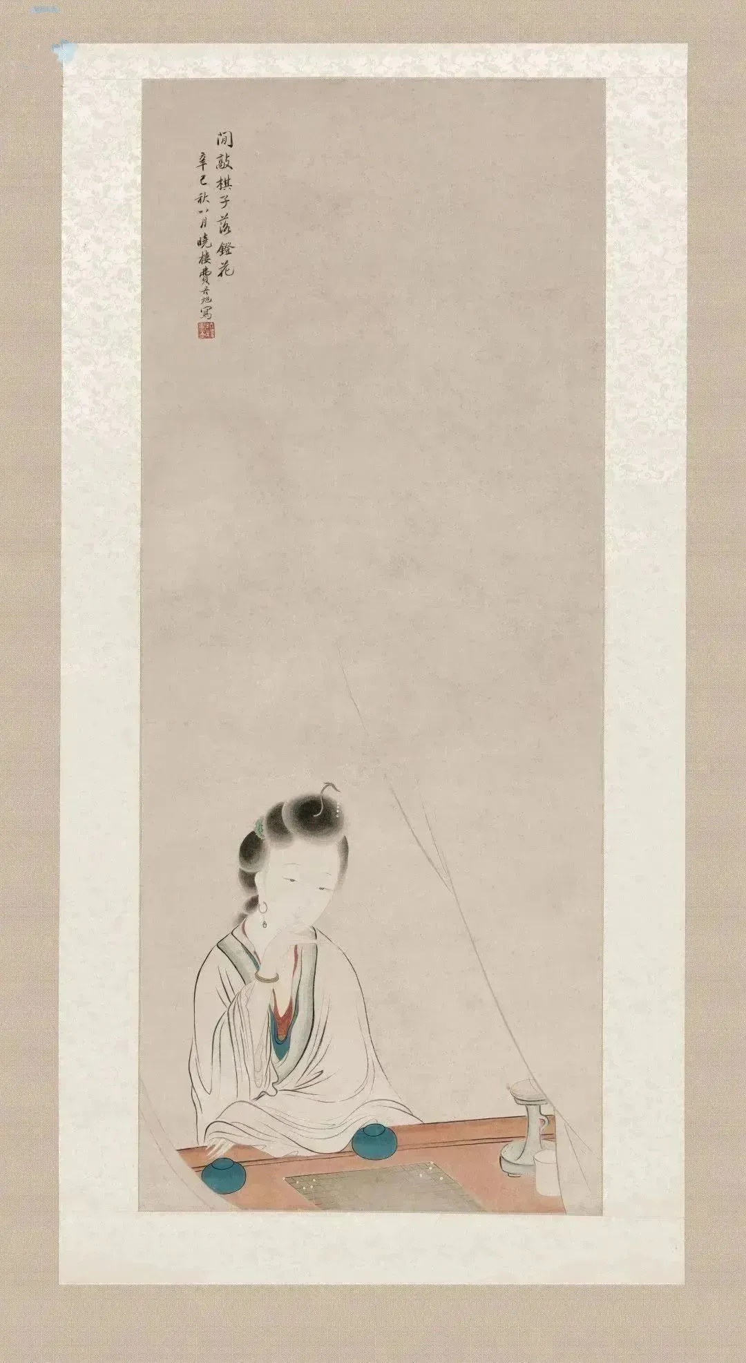 图绘白幛青灯下,一古妆仕女用围棋打谱,人物娴雅,用两头尖中间圆润的”柳叶描“。傅色清逸,很好地表达了”闲敲棋子落灯花“的诗意。
