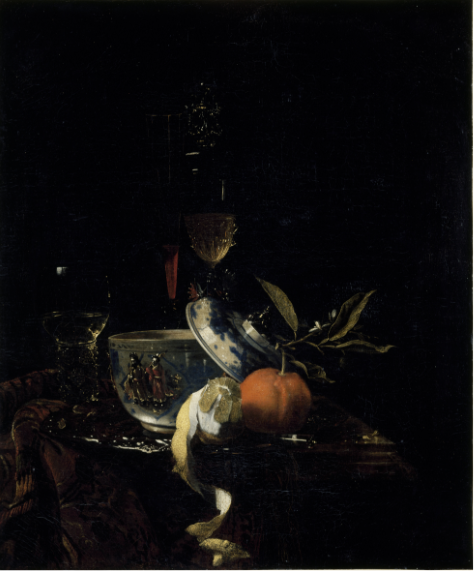 威廉·卡尔夫是荷兰黄金时代杰出的静物画家。他的许多作品属于奢华静物画,着重表现各种材质的华丽器皿。 画中的青花盖碗可能用作糖罐,这件盖碗和地毯无疑是东方舶来品,玻璃杯和银盘价值不菲,就连柠檬和酸橙在当时也是带有异域色彩的奢侈水果。许多17世纪中叶的静物画都呈现这样的组合,似乎再现了富人宅第的一隅,这类作品在荷兰风靡一时。